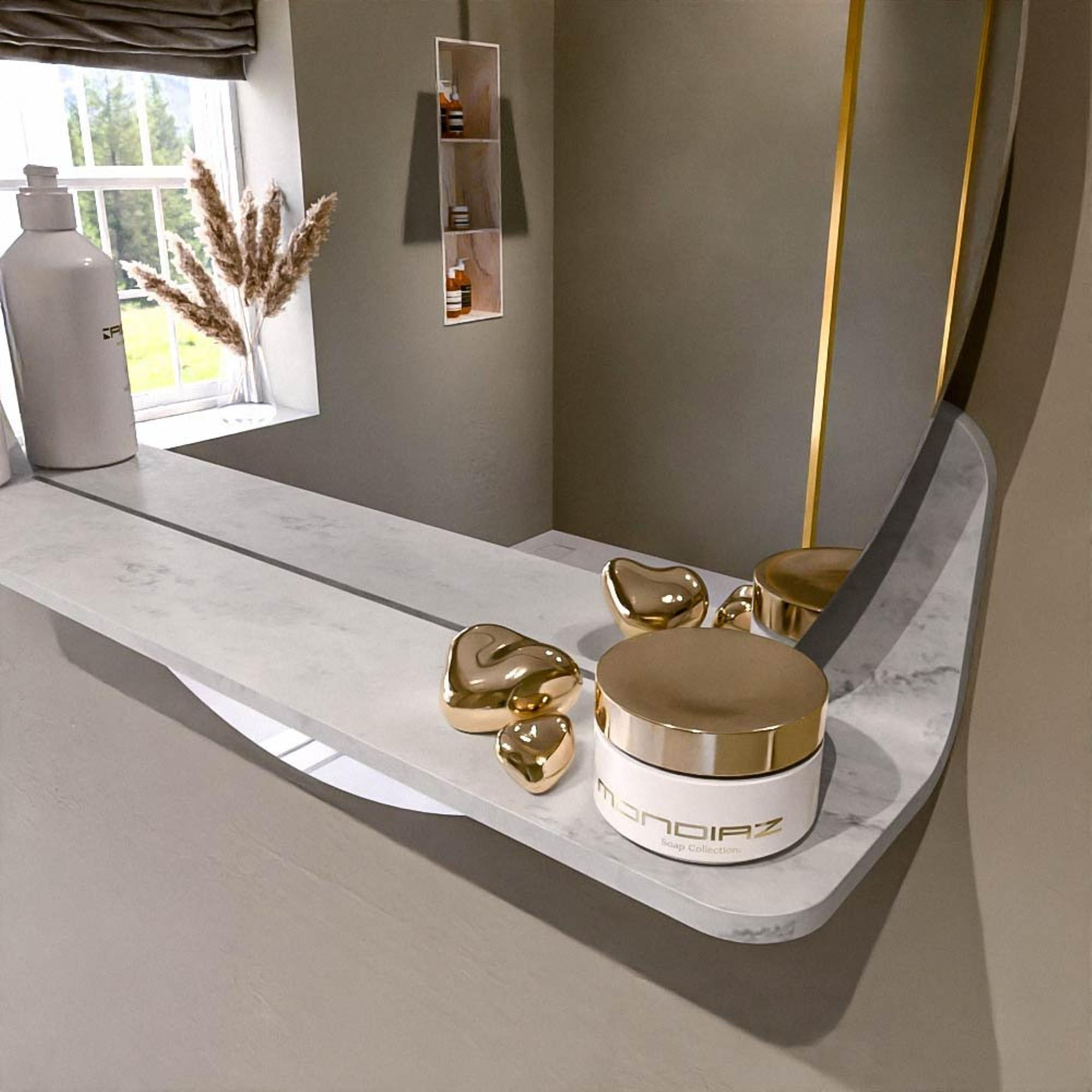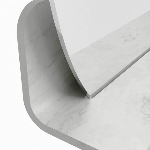 Het planchet, met zijn vloeiend afgeronde hoeken, biedt handige opbergruimte voor uw dagelijkse benodigdheden. De spiegel is subtiel verzonken in het planchet, wat zorgt voor een moderne en stijlvolle uitstraling.