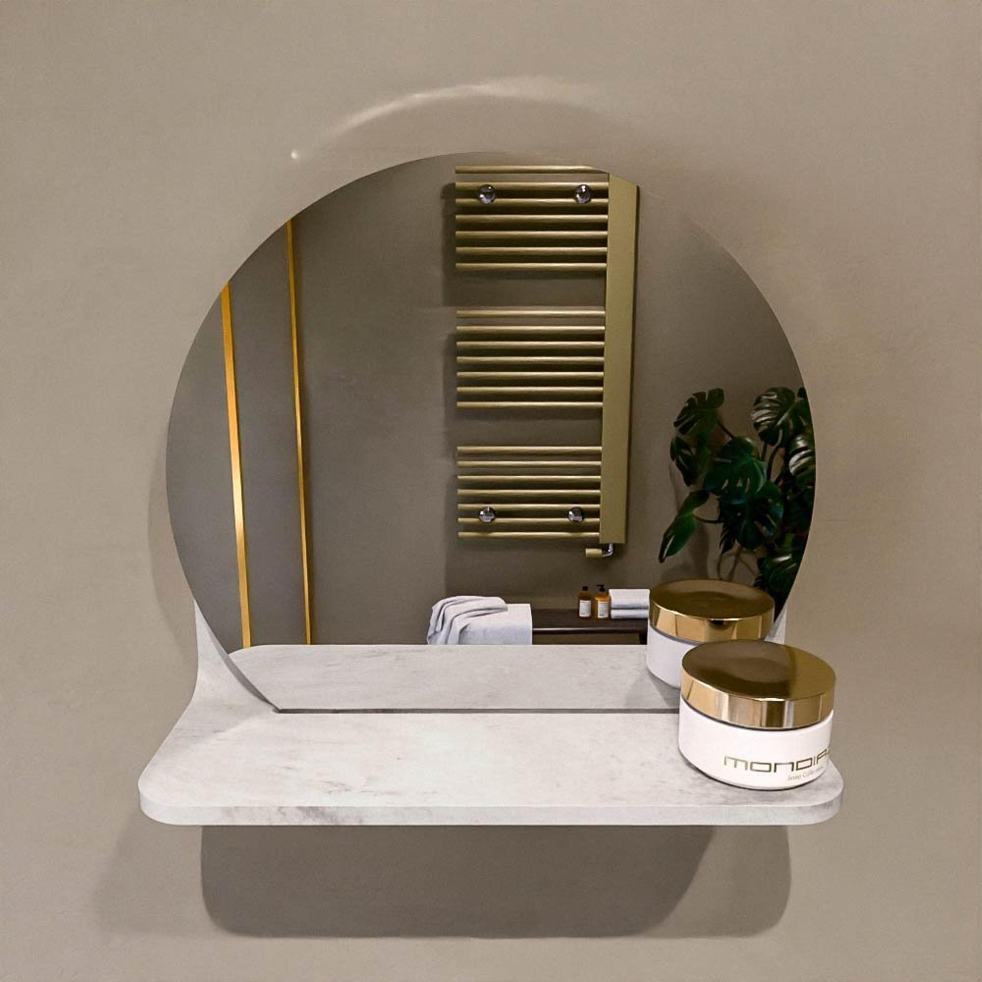 Geef uw ruimte een elegante en praktische Touch met deze ronde spiegel, waarbij de spiegel prachtig is verwerkt in een verfijnd planchet van Corian Solid Surface. Het design is niet alleen functioneel, maar ook een stijlvolle toevoeging aan moderne interieurs, ideaal te combineren met onze de DLUX-serie, zoals de ALAN, de VICA en de TURE DLUX.