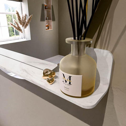 Het planchet, met zijn vloeiend afgeronde hoeken, biedt handige opbergruimte voor uw dagelijkse benodigdheden. De spiegel is subtiel verzonken in het planchet, wat zorgt voor een moderne en stijlvolle uitstraling.