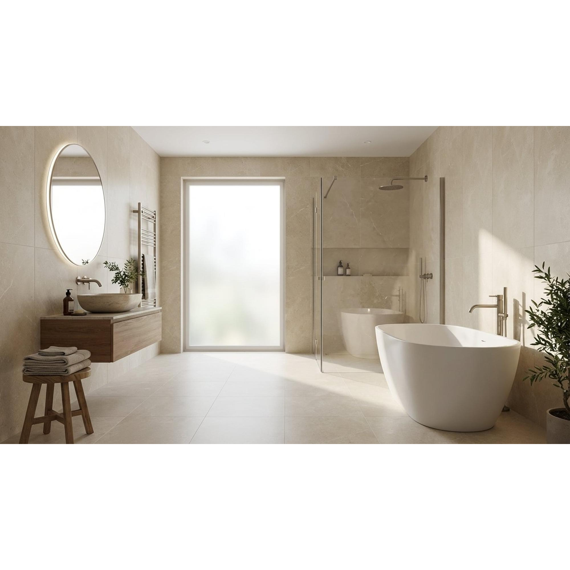 Keramische tegels in dit formaat zijn bij uitstek geschikt om te combineren met vloerverwarming in de badkamer of op de benedenverdieping. De tegel geleidt warmte uitstekend, waardoor de vloer snel aangenaam aanvoelt en de warmte gelijkmatig wordt verdeeld. Dankzij de neutrale, witte tot licht pietra-achtige kleurlijn vormt hij een veelzijdige basis onder vrijwel iedere badkamerstijl, van Scandinavisch licht tot industrieel en hotel-chic. Doordat deze tegel zowel als vloer- als wandtegel toepasbaar is, kun je de ruimte rustig en samenhangend inrichten: dezelfde tegel op vloer, douchewand en achterwand van het bad zorgt voor een hoogwaardige, architectonische uitstraling. Zo leg je in één keer een solide, toekomstbestendige basis waar je jarenlang met plezier naar kijkt.