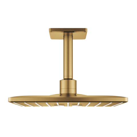 Met de GROHE Rainshower 310 SmartActive regendoucheset haal je topkwaliteit in huis met een strak design. De grote regendouche is voorzien van de meest geavanceerde functies voor een perfecte douchebeleving. Uitgevoerd in een prachtig ontwerp ziet de handdouche er in cool sunrise geborsteld (mat goud) clean en chic uit. De GROHE Rainshower regendouche biedt keuze uit twee straalsoorten die je afzonderlijk of gecombineerd kunt gebruiken. Zo voelt de GROHE PureRain spray zacht als een regenbui en de GROHE ActiveRain spray verwent je met een heerlijke hoofd-, nek- en rugmassage. Je kunt de regendoucche bedienen via de apart verkrijgbare Grohtherm SmartControl thermostaatkraan of GROHE SmartControl mengkraan. De GROHE DreamSpray technologie zorgt ervoor dat je geniet van een heerlijke douchestraal waarbij het water gelijkmatig over de sproeigaatjes wordt verdeeld. Dankzij de anti-kalk SpeedClean technologie en de GROHE Long-Life afwerking blijft de regendouche kalkvrij en is optimaal beschermd tegen krassen. De vierkante regendouche is ontworpen voor een plafondmontage met de GROHE Rainshower inbouwbox 26484000 (met waterbesparende GROHE WaterSaving technologie functie) of 26483000 (zonder GROHE WaterSaving technologie). bestaat uit: