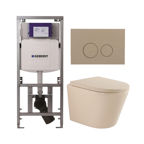 QeramiQ Dely Toiletset - 36.3x51.7cm - diepspoel - rimless - Geberit UP320 inbouwreservoir - softclose toiletzitting - taupe bedieningsplaat - ronde knoppen - mat beige