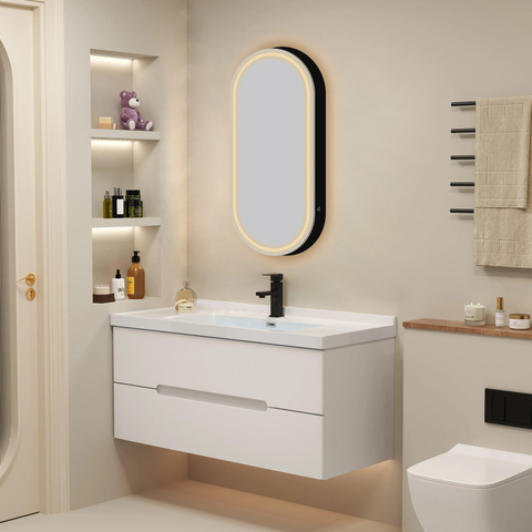 De strakke, ovale vorm en de zwarte afwerking maken deze spiegelkast tot een echte blikvanger in je badkamer. Het design is modern en toch tijdloos, waardoor het moeiteloos aansluit bij verschillende interieurstijlen. De indirecte LED-verlichting zorgt voor een zachte, sfeervolle gloed die de ruimte op een warme manier verlicht. Zo creëer je een ontspannen ambiance waarin je je elke dag weer prettig voelt. Deze combinatie van vorm en licht maakt de kast niet alleen mooi om te zien, maar ook een echte sfeermaker.