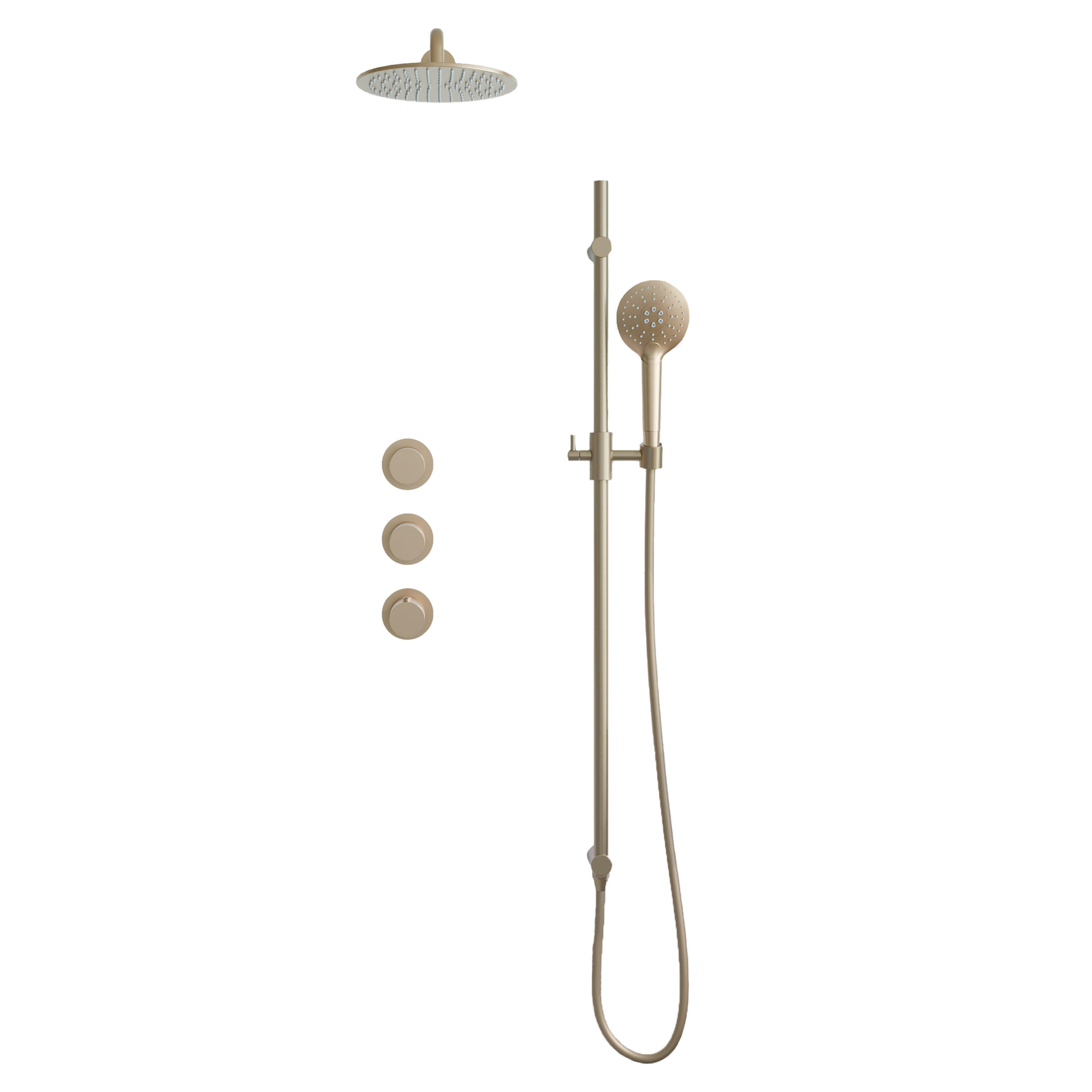 Fortifura Nebbio Regendoucheset - inbouwkraan - inbouwdeel - glijstang - doucheslang glad - ronde handdouche - 35cm wandarm - 30cm ronde hoofddouche - geborsteld messing PVD (goud)