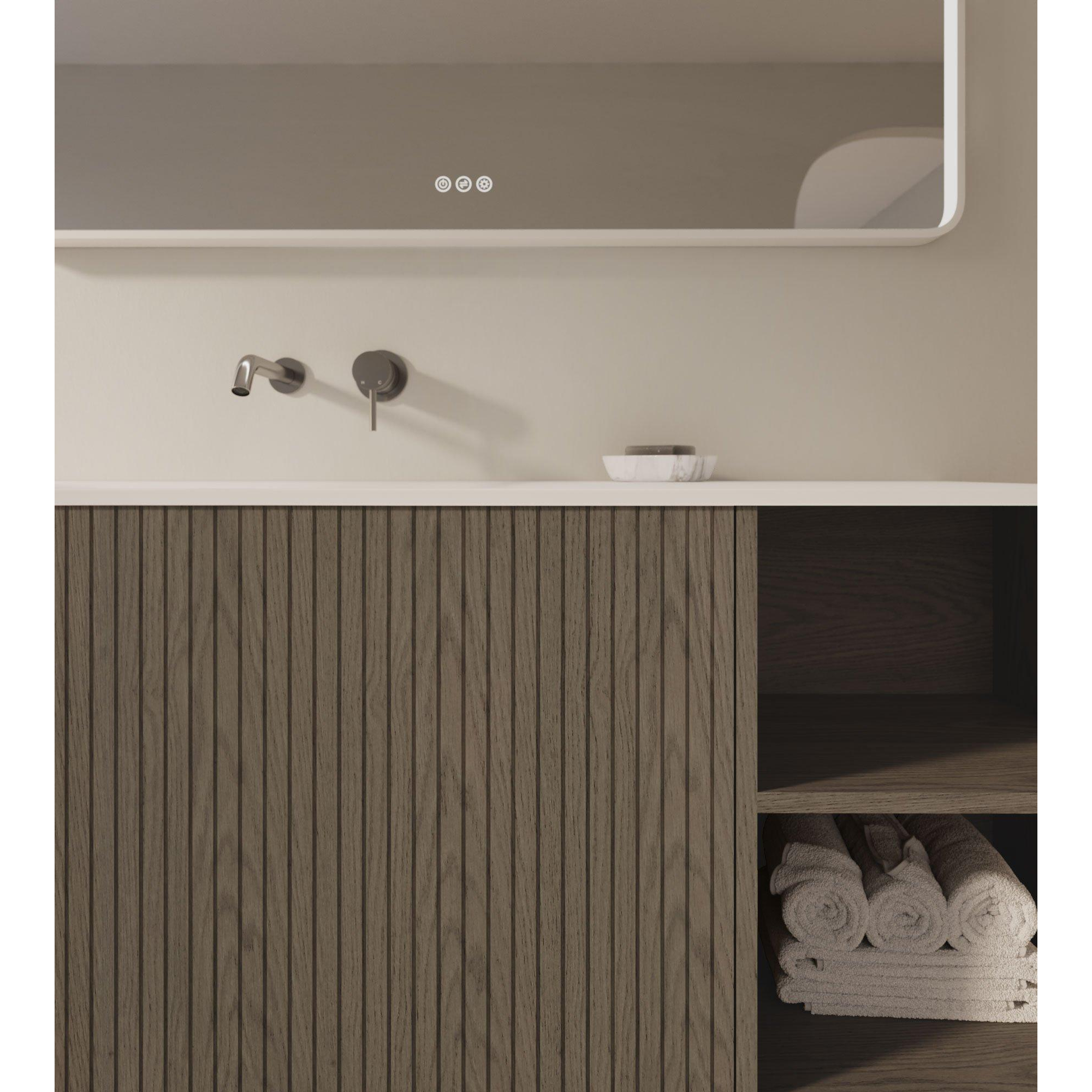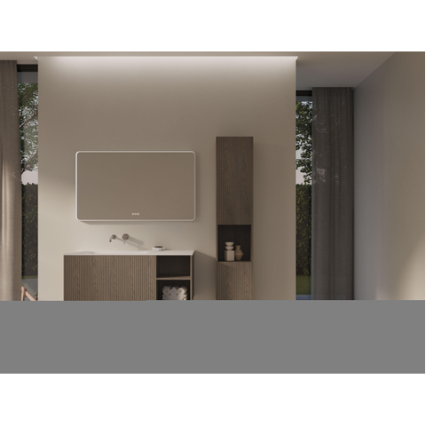 De Thebalux Set Linea onderkast inliggend fineer natural Ribbd met nis is een toonbeeld van elegantie. Het natuurlijke fineer en de ribbelige afwerking voegen een vleugje verfijning toe aan je badkamer. De push open lade zorgt voor een naadloze en minimalistische uitstraling, terwijl de wastafel van Corian pure white een tijdloze elegantie uitstraalt.