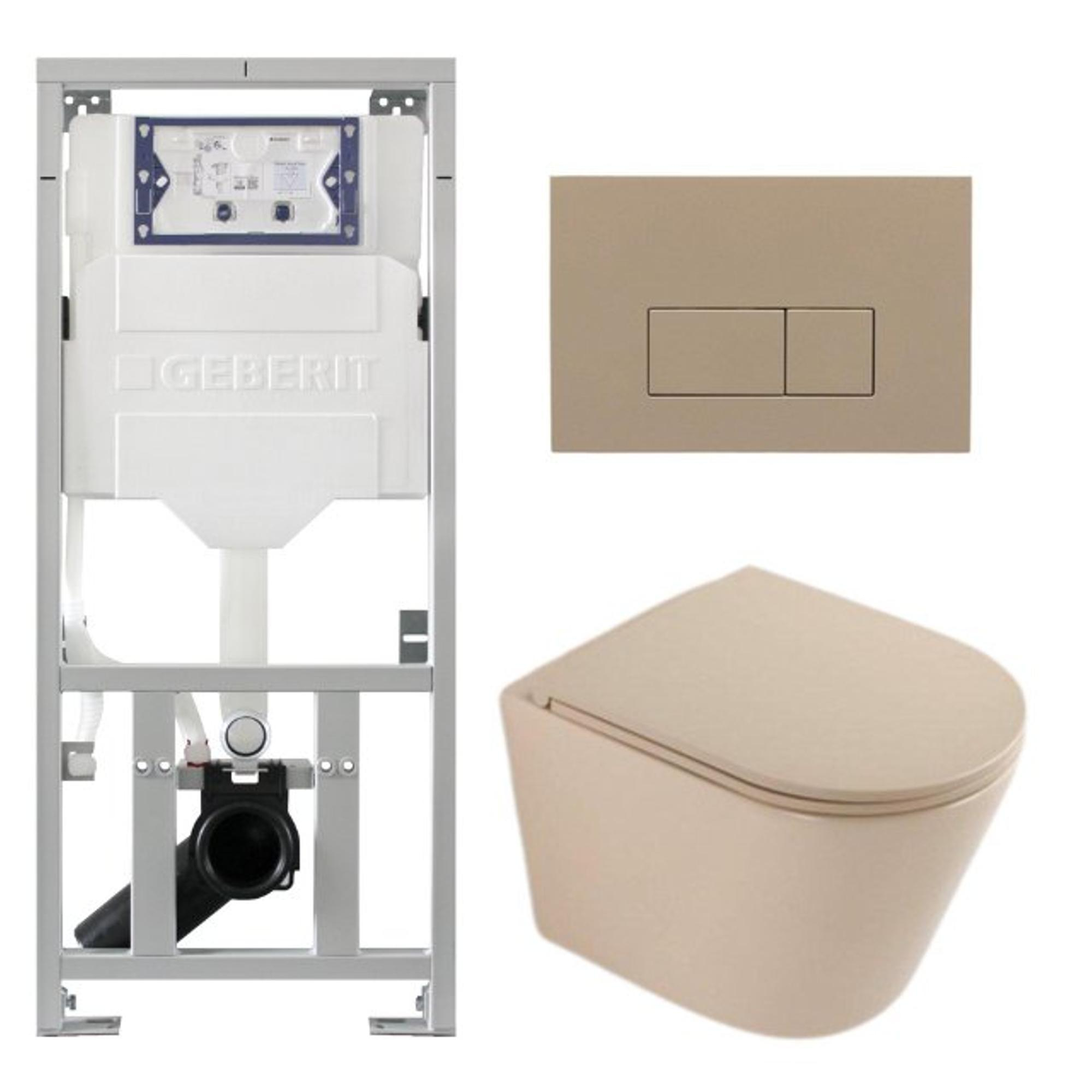 QeramiQ Dely Toiletset - 36.3x51.7cm - diepspoel - rimless - Geberit UP320 inbouwreservoir - softclose toiletzitting - taupe bedieningsplaat - rechtehoekige knoppen - mat beige