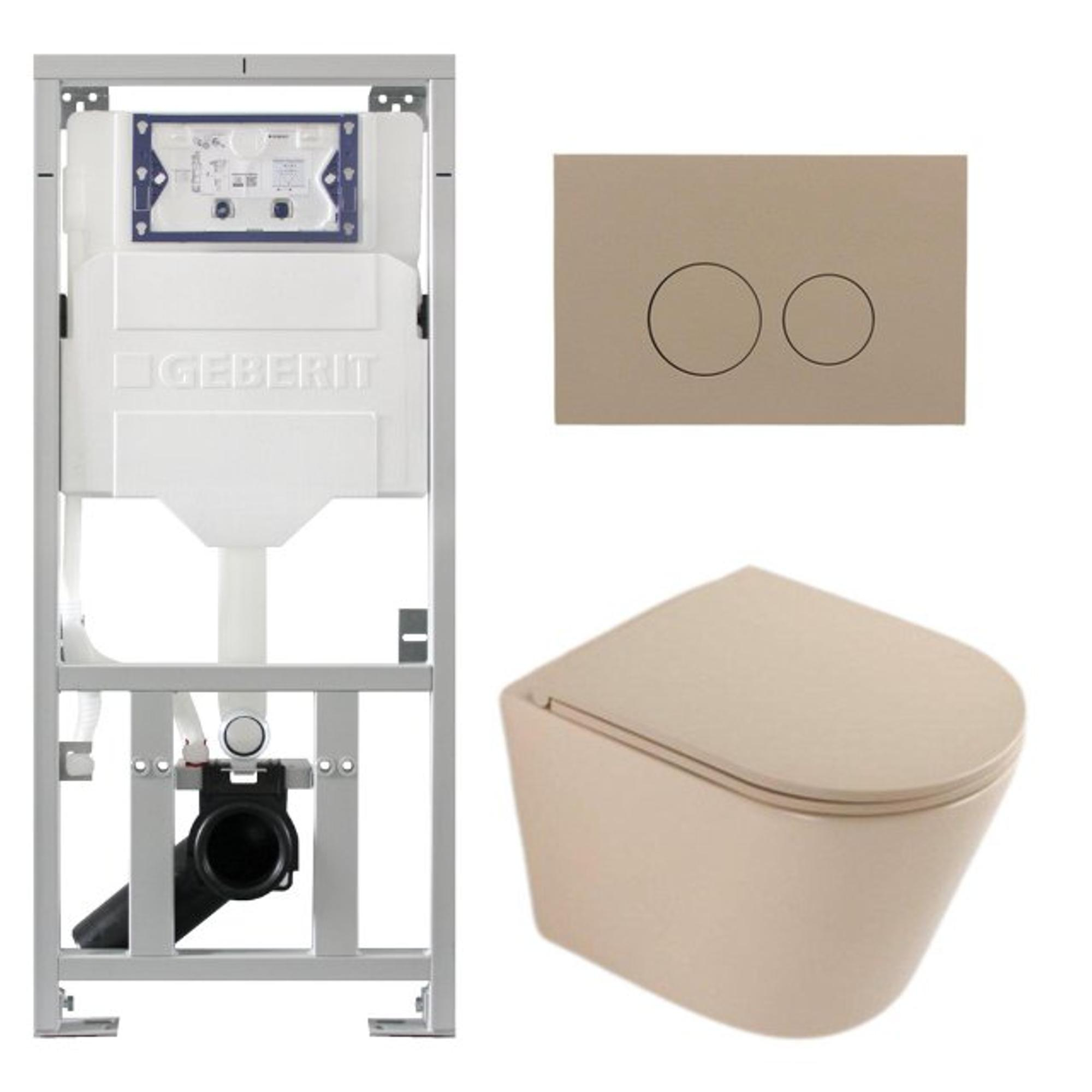 QeramiQ Dely Toiletset - 36.3x51.7cm - diepspoel - rimless - Geberit UP320 inbouwreservoir - softclose toiletzitting - taupe bedieningsplaat - ronde knoppen - mat beige