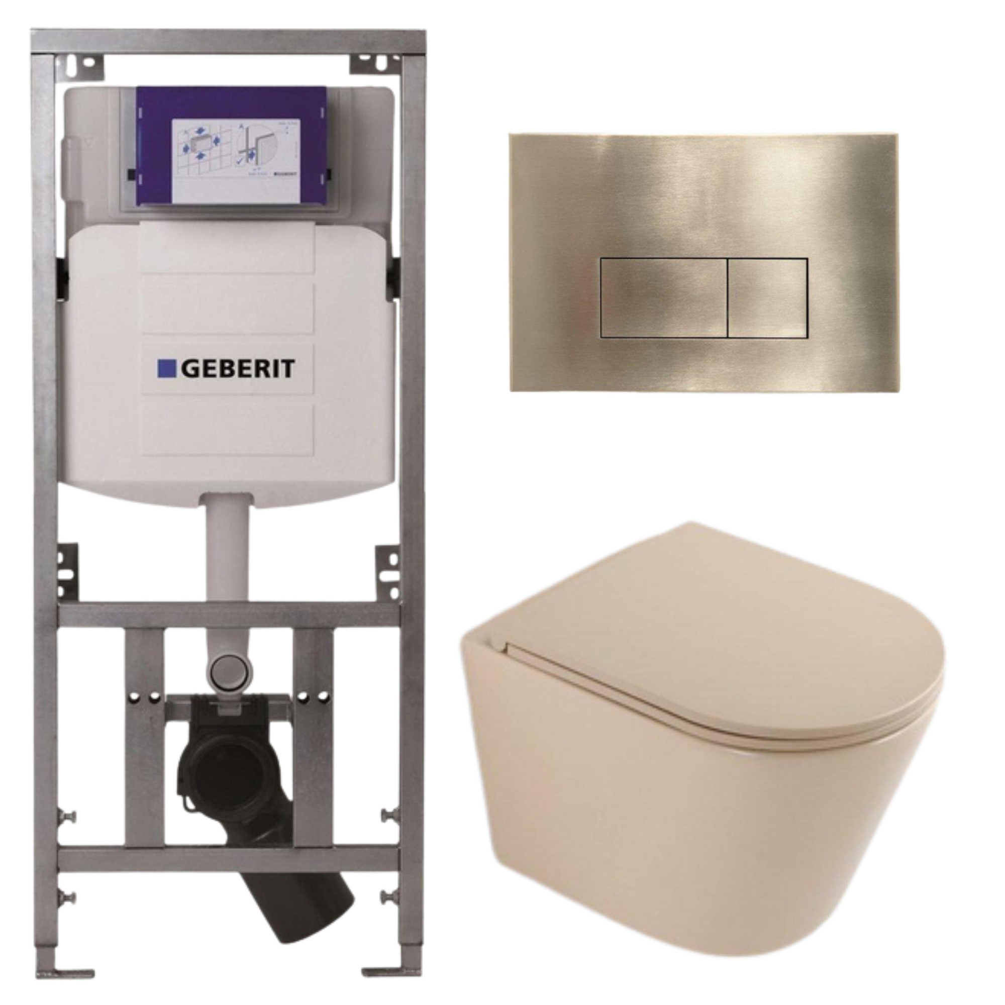 QeramiQ Dely Toiletset - 36.3x51.7cm - diepspoel - rimless - Geberit UP320 inbouwreservoir - softclose toilet zitting - geborsteld messing bedieningsplaat - rechthoekige knoppen - mat beige