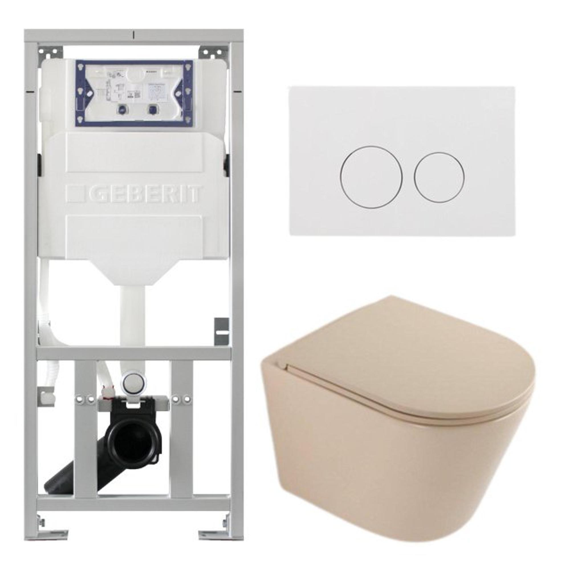 QeramiQ Dely Toiletset - 36.3x51.7cm - diepspoel - rimless - Geberit UP320 inbouwreservoir - softclose toiletzitting - glans witte bedieningsplaat - ronde knoppen - mat beige
