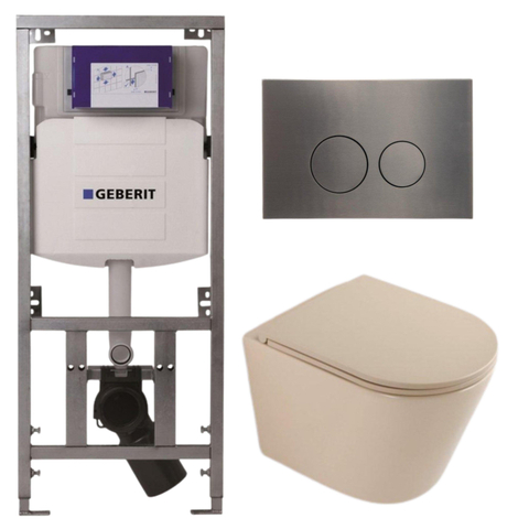 QeramiQ Dely Toiletset - 36.3x51.7cm - diepspoel - rimless - Geberit UP320 inbouwreservoir - softclose toilet zitting - gunmetal bedieningsplaat - ronde knoppen - mat beige