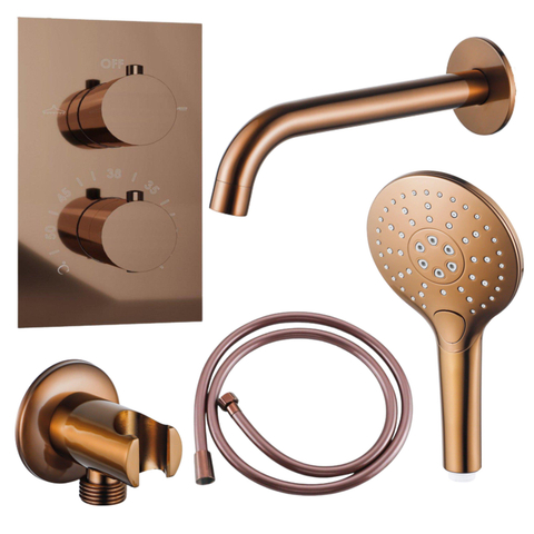 Fortifura Calvi Badkraan set - uitloop - 22cm inkortbaar - gladde slang - ronde handdouche - inbouwdeel - wandhouder - geborsteld koper PVD