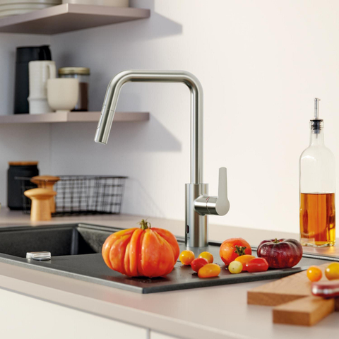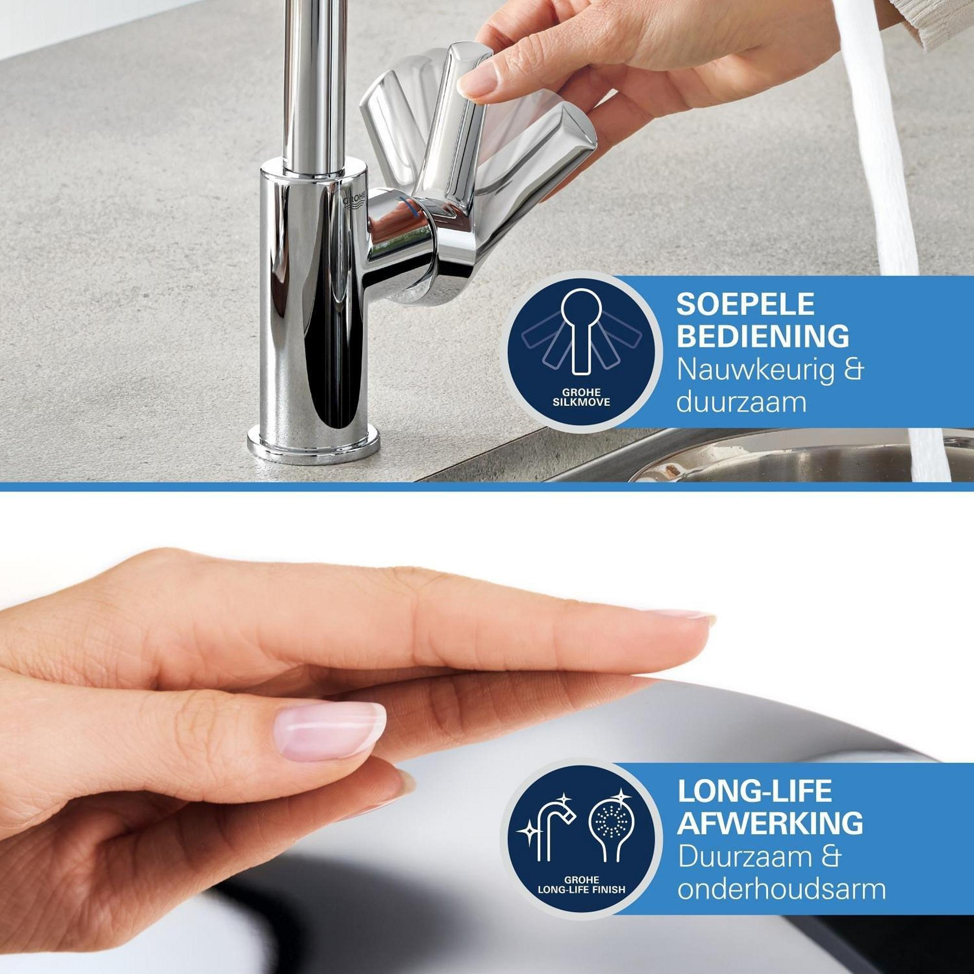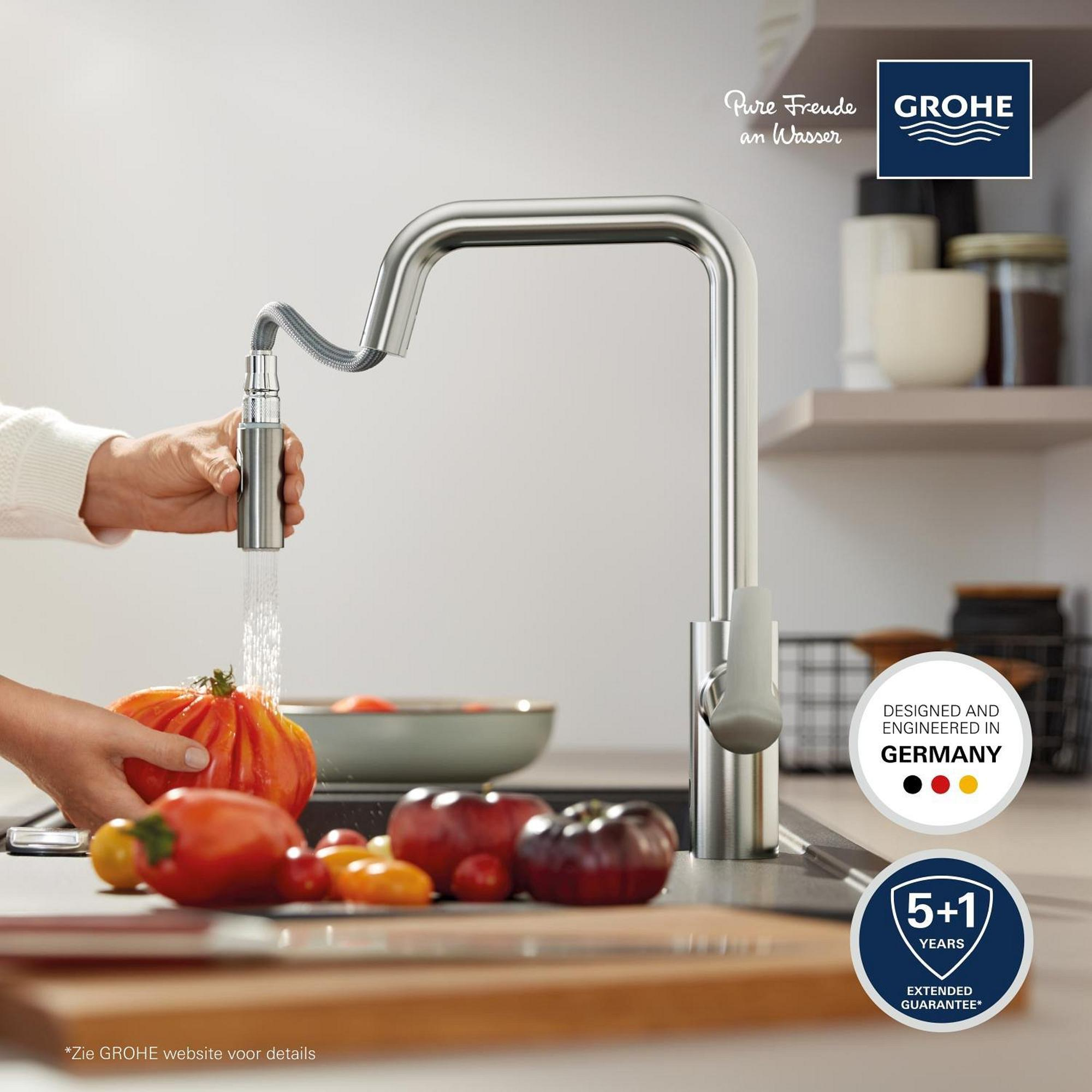 Deze keukenmengkraan is uitgerust met een uittrekbare handdouche met twee straalsoorten, waardoor je moeiteloos kunt schakelen tussen een laminaire straal en een krachtige SpeedClean douchestraal. De anti-kalk functie zorgt ervoor dat de sproeiers schoon blijven en de waterstroom optimaal blijft, zelfs bij hard water. Dankzij de GROHE SilkMove cartridge is de bediening soepel en nauwkeurig, wat zorgt voor een prettige en betrouwbare gebruikservaring. De kraan is eenvoudig te installeren met het meegeleverde QuickTool, zodat je snel kunt genieten van alle voordelen die deze kraan te bieden heeft.Kenmerken:
