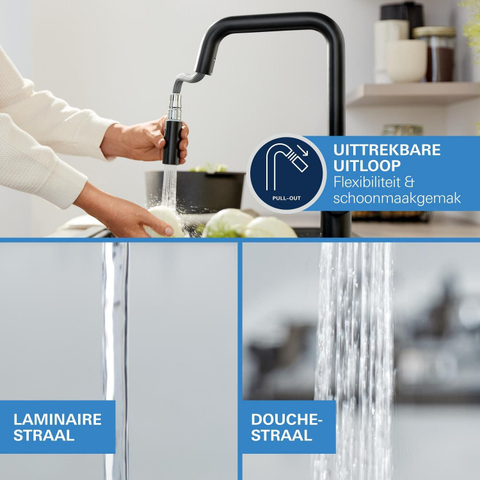 Deze keukenmengkraan is uitgerust met slimme functies die het gebruiksgemak verhogen. De uittrekbare handdouche met twee straalsoorten – een laminaire straal en een krachtige SpeedClean douchestraal – maakt het schoonmaken van de spoelbak en het vullen van pannen eenvoudiger dan ooit. De draaibare uitloop met een zwenkbereik van 150 graden biedt maximale flexibiliteit. Daarnaast zorgt de duurzame GROHE SilkMove technologie voor een soepele en nauwkeurige bediening, terwijl de QuickMount installatie het monteren snel en eenvoudig maakt.