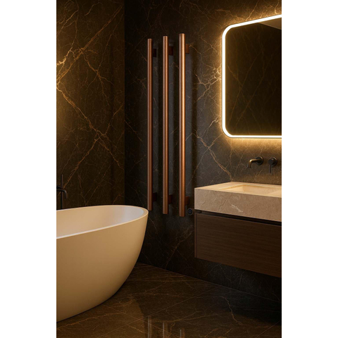 De geborsteld koperen PVD-afwerking geeft deze handdoekradiator direct een luxueuze en onderscheidende uitstraling. In tegenstelling tot standaard wit of chroom wordt koper een echt stijlstatement in je badkamer en vormt het een prachtig accent bij bijvoorbeeld zwarte kranen, marmerlook tegels of natuurlijke materialen zoals hout. De ronde buizen ogen zacht en vriendelijk, terwijl de strakke, verticale lijn rust brengt in het geheel. Doordat de radiator compact is in breedte (57 cm) en hoogte (115 cm), kun je hem makkelijk integreren naast de douche, naast het bad of bij de wastafel. Zo wordt het niet alleen een functioneel verwarmingspunt, maar ook een designelement dat je badkamer direct een hoogwaardige en persoonlijke uitstraling geeft.