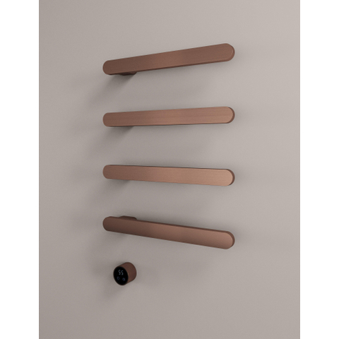 Deze compacte handdoekradiator is ideaal als je op zoek bent naar een stijlvolle manier om handdoeken te verwarmen zonder een grote radiator aan de muur te hoeven hangen. Dankzij het horizontale ontwerp met vier strakke armen is dit een perfecte oplossing naast je wastafel, in een kleine badkamer, toiletruimte of luxe inloopdouche. De warme koperkleur met geborstelde afwerking geeft direct sfeer, terwijl het elektrische element met schakelaar je veel flexibiliteit biedt: je verwarmt alleen wanneer jij het nodig hebt. Zo combineer je een opgeruimde, designgerichte uitstraling met praktisch dagelijks comfort, ook in badkamers waar weinig wandruimte beschikbaar is of waar al vloerverwarming aanwezig is.