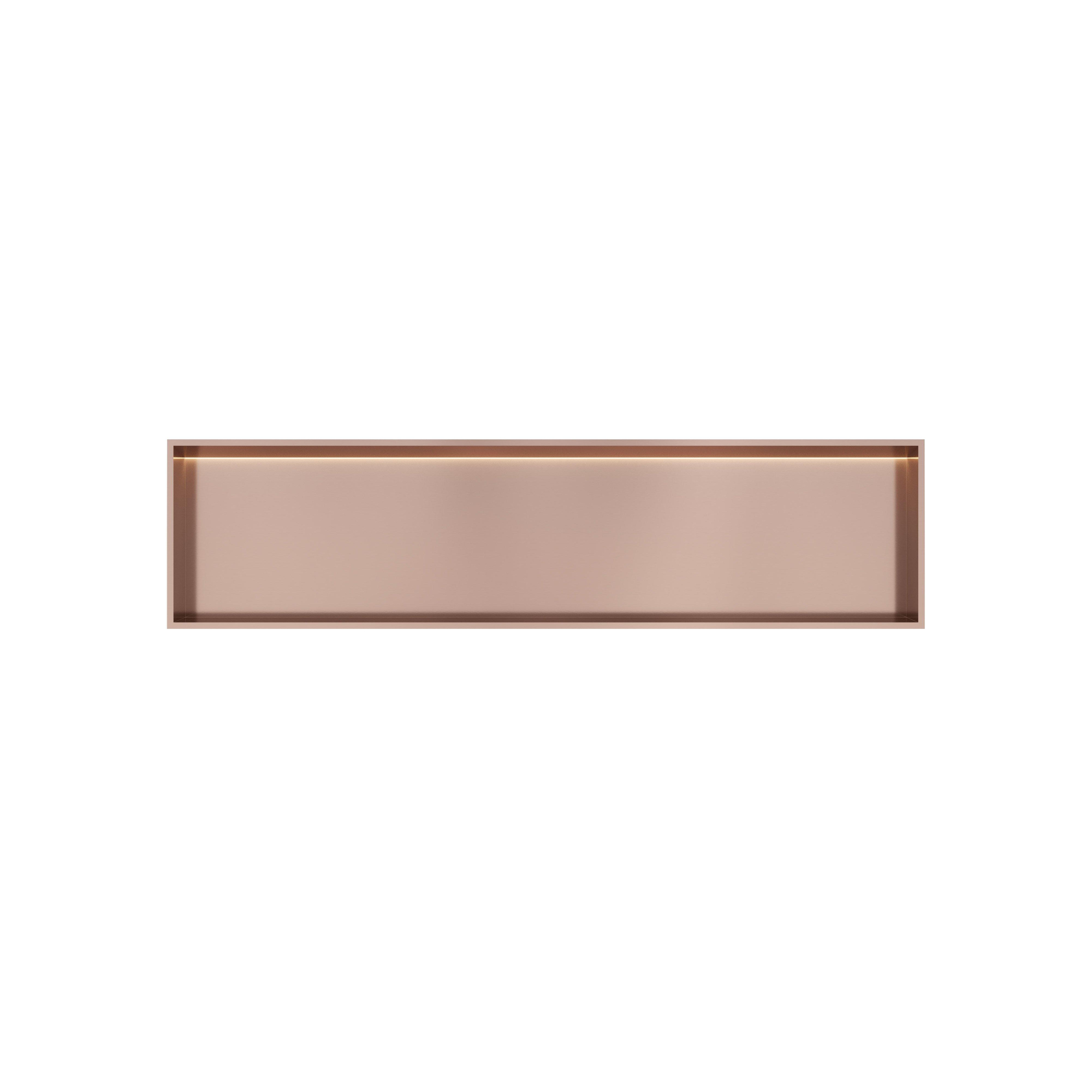 Geef je badkamer een stijlvolle upgrade met deze prachtige inbouwnis die niet alleen praktisch is, maar ook een warme en luxe sfeer toevoegt. Dankzij het doordachte ontwerp creëer je een subtiele opbergplek die naadloos in de wand verdwijnt, waardoor je badkamer er strak en opgeruimd uitziet. De geïntegreerde LED-verlichting zorgt voor een sfeervol lichtaccent, perfect om je favoriete verzorgingsproducten altijd goed zichtbaar en binnen handbereik te hebben. Met een royale afmeting van 30x120x10 cm biedt deze nis voldoende ruimte, zonder dat het teveel plek inneemt. Zo is hij ideaal voor zowel compacte als ruime badkamers. De geborstelde koperkleur met hoogwaardige PVD-coating geeft een exclusieve, duurzame finish die jarenlang mooi blijft en een warme uitstraling geeft aan je badkamerinterieur.