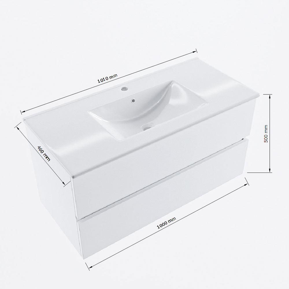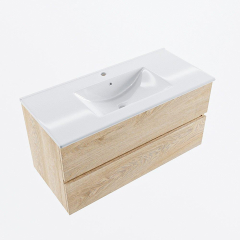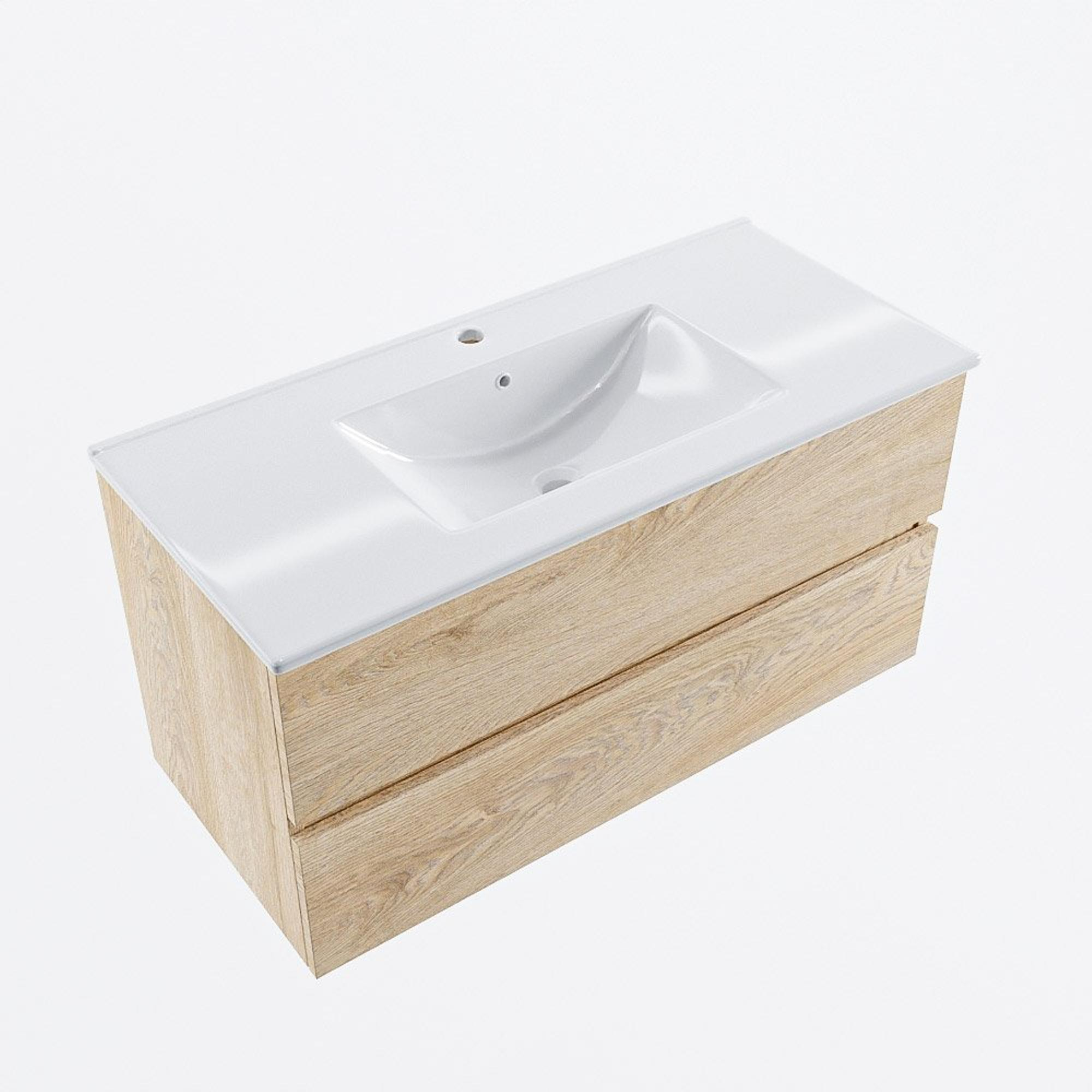 MONDIAZ VICA 100cm badmeubel onderkast Washed Oak 2 lades. Wastafel DENIA midden 1 kraangat, kleur Glanzend Wit.