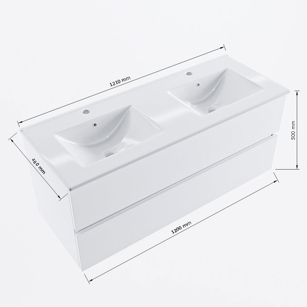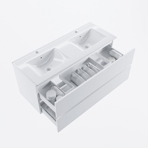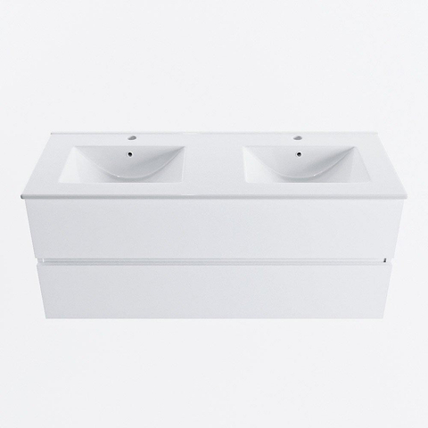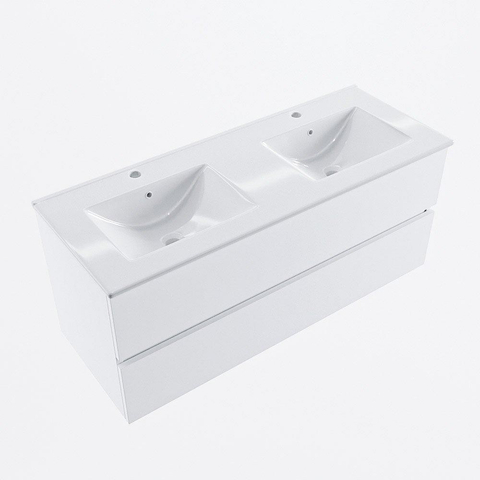 MONDIAZ VICA 120cm badmeubel onderkast Talc 2 lades. Wastafel DENIA dubbel 2 kraangaten, kleur Glanzend Wit.