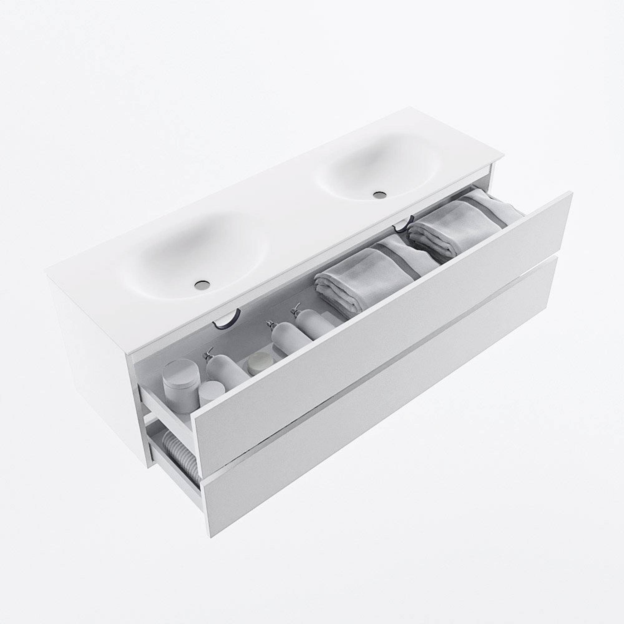 MONDIAZ VICA 150cm badmeubel onderkast Talc 2 lades. Wastafel MOON dubbel 2 kraangaten, kleur Talc.