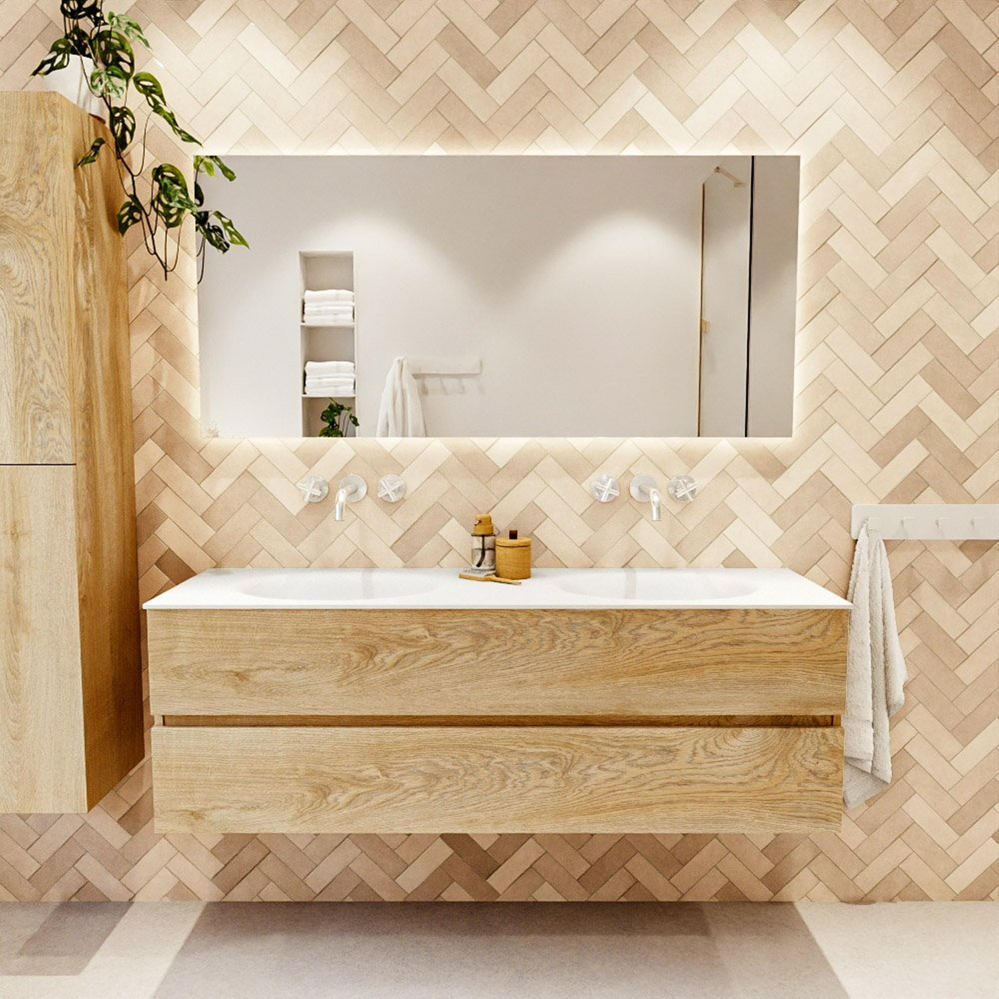 MONDIAZ VICA 150cm badmeubel onderkast Washed Oak 2 lades. Wastafel MOON dubbel zonder kraangat, kleur Talc.