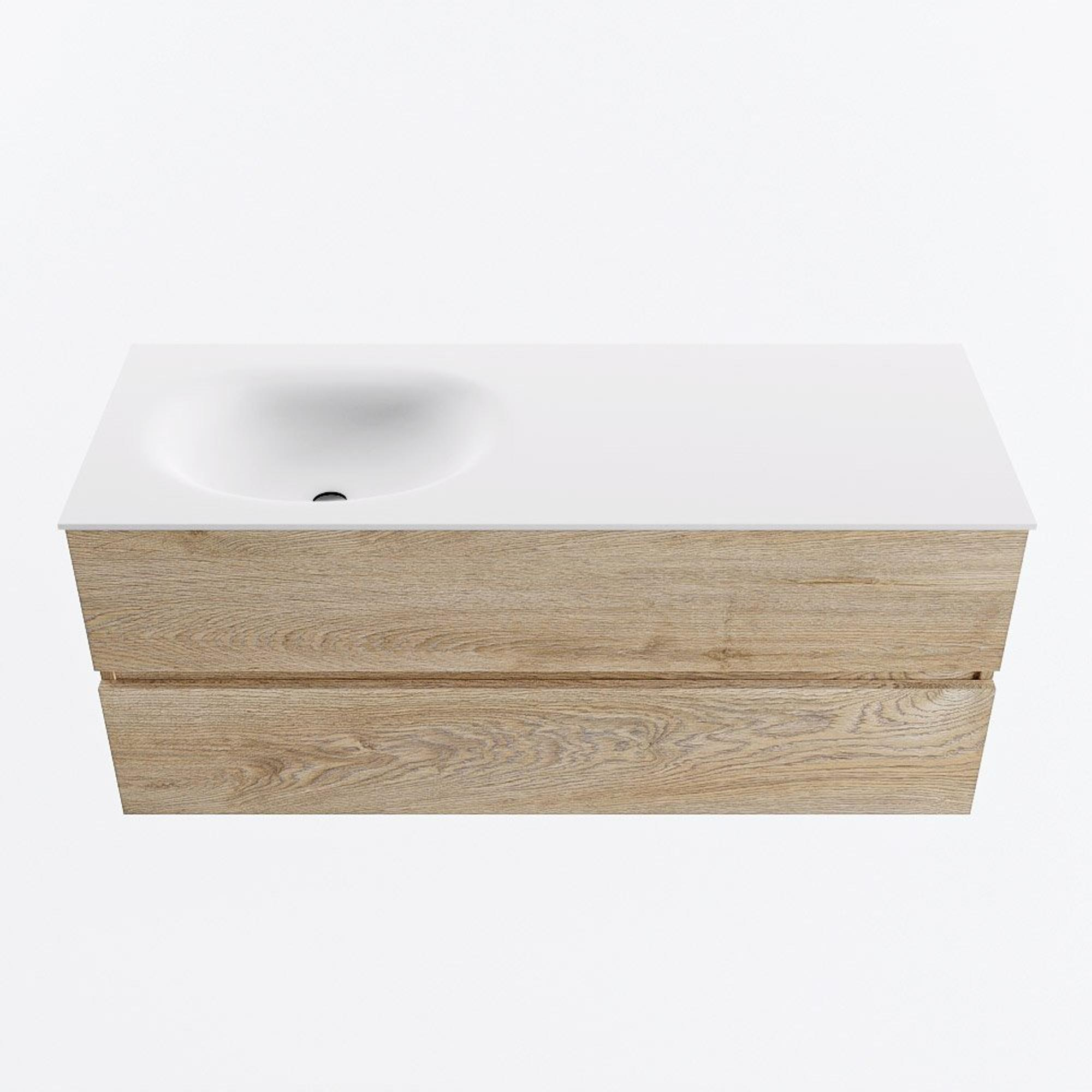 MONDIAZ VICA 120cm badmeubel onderkast Washed Oak 2 lades. Wastafel MOON links zonder kraangat, kleur Talc.