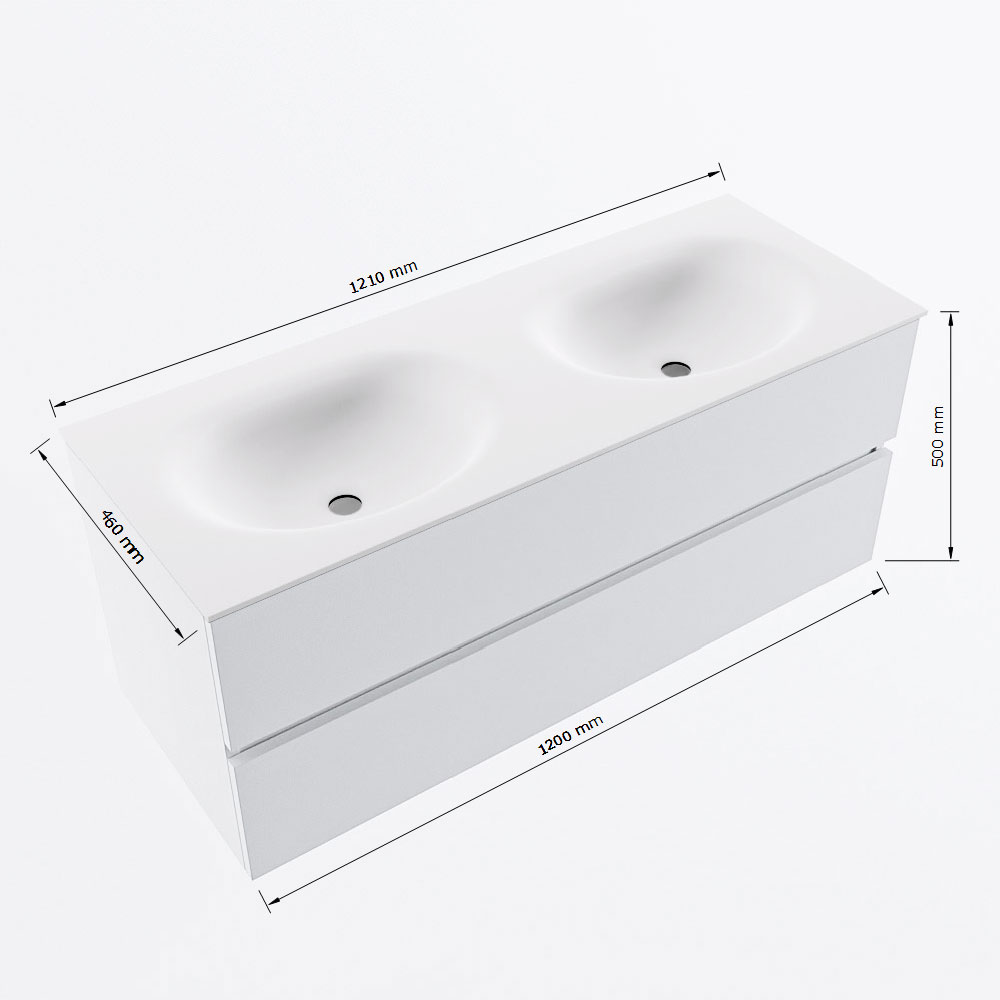 Naast zijn esthetische waarde is dit badmeubel ook zeer functioneel. De twee ruime lades bieden voldoende opbergruimte voor al jouw badkamerbenodigdheden, terwijl de dubbele wastafel ervoor zorgt dat er genoeg ruimte is voor twee personen om tegelijkertijd gebruik te maken van de wastafel. Dit maakt het badmeubel ideaal voor drukke ochtenden of ontspannende avonden.