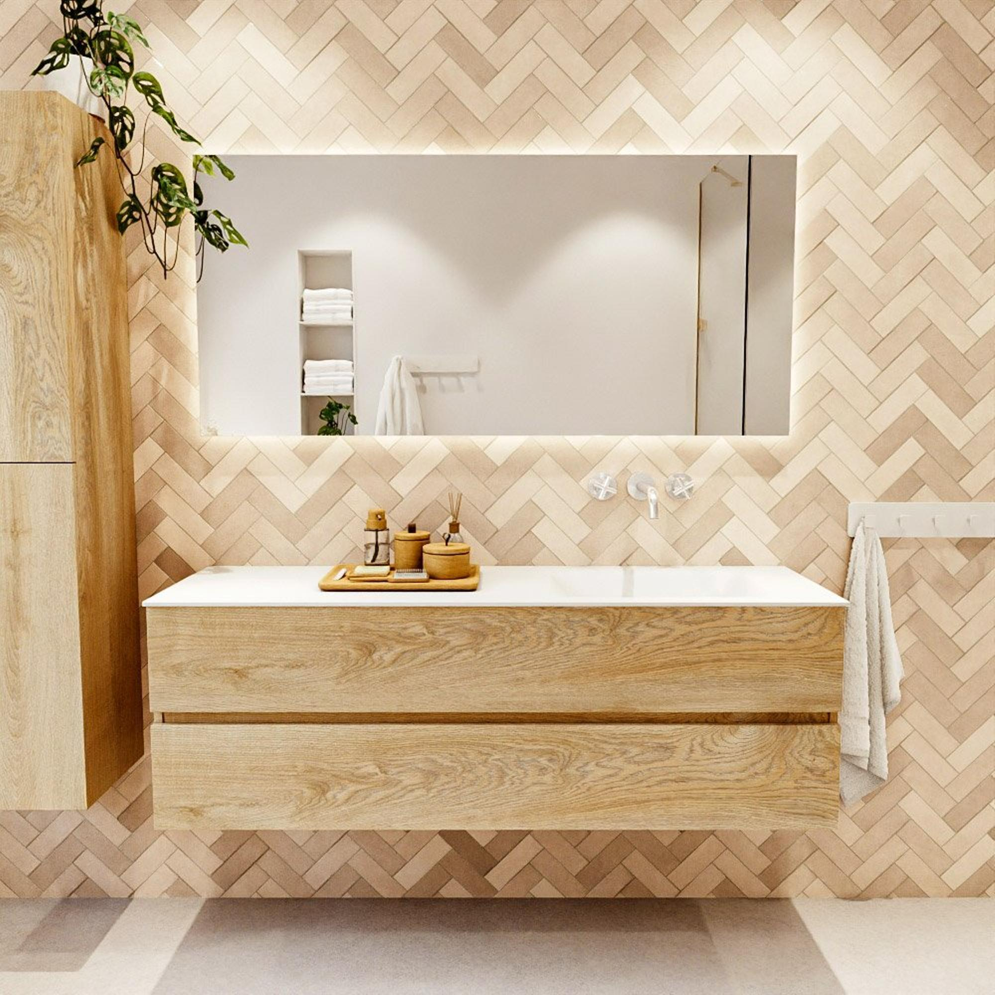 MONDIAZ VICA 150cm badmeubel onderkast Washed Oak 2 lades. Wastafel CLOUD rechts zonder kraangat, kleur Talc.