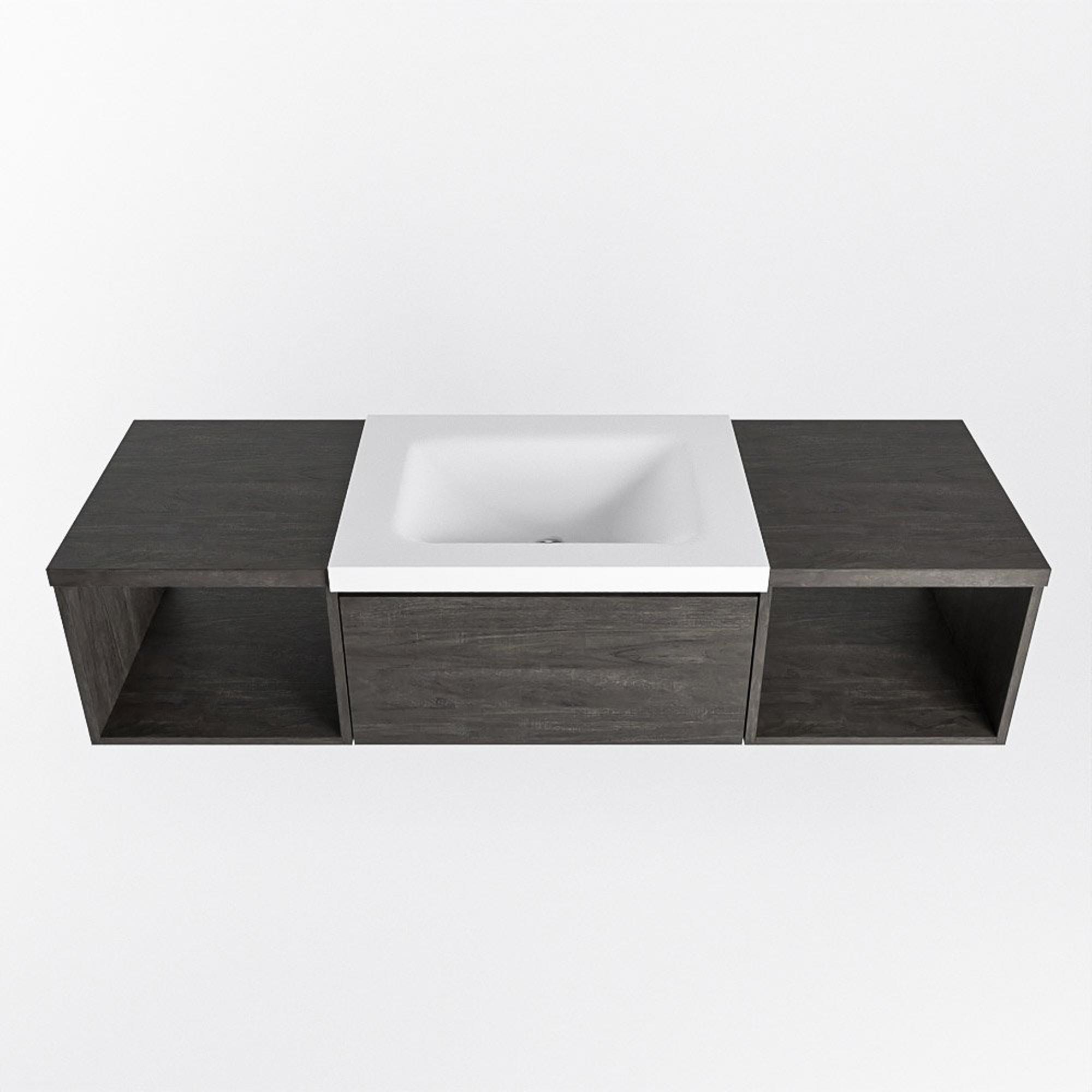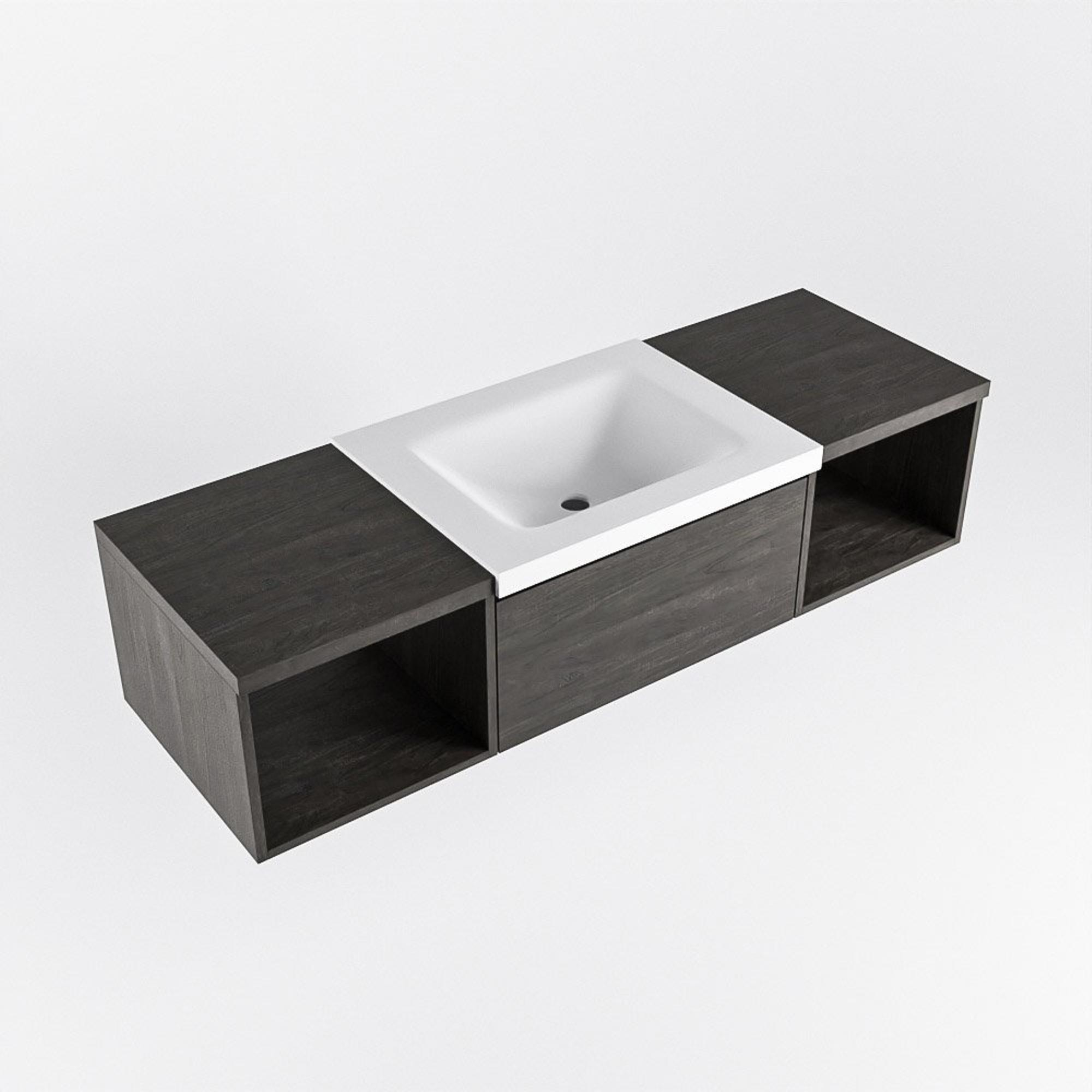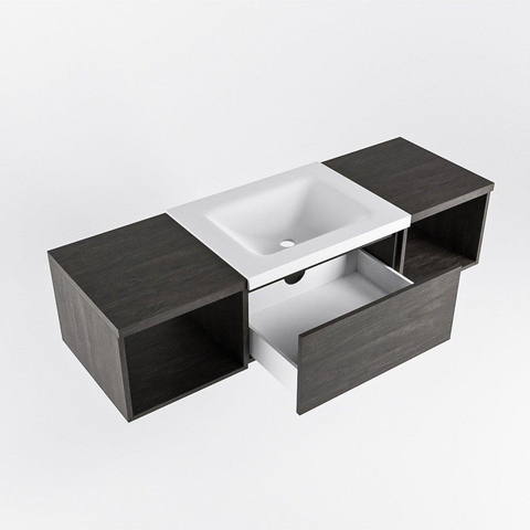 Het design van dit badmeubel is stijlvol en tijdloos. De combinatie van de open module en de lades zorgt voor een speelse uitstraling, terwijl de strakke lijnen en subtiele details een moderne touch toevoegen aan de badkamer. De wastafel met middenpositie en geen kraangaten zorgt voor een minimalistische look.