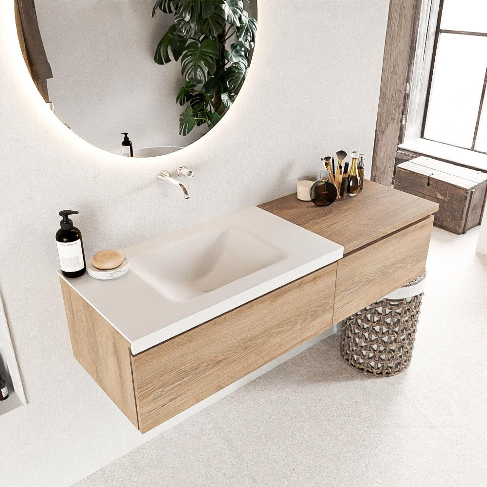 MONDIAZ BUKLA 140cm badmeubel met module 60 kleur Washed Oak met 2 lades. Wastafel CLOUD links 0 kraangaten kleur Talc.