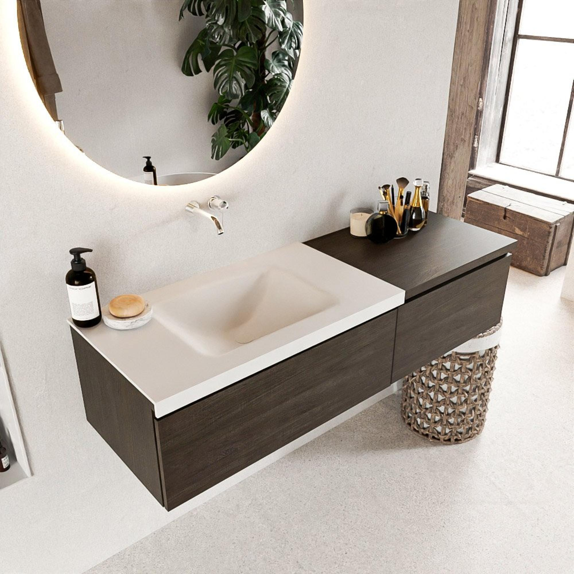 MONDIAZ BUKLA 140cm badmeubel met module 60 kleur Dark Brown met 2 lades. Wastafel CLOUD links 0 kraangaten kleur Talc.