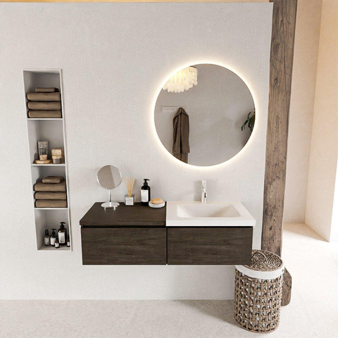 Ervaar een vleugje luxe in je badkamer met dit badmeubel. De combinatie van de Dark Brown kleur en de Talc kleur van de wastafel creëert een verfijnde uitstraling. De hoogwaardige materialen zorgen voor duurzaamheid en een tijdloze elegantie die jarenlang meegaat.