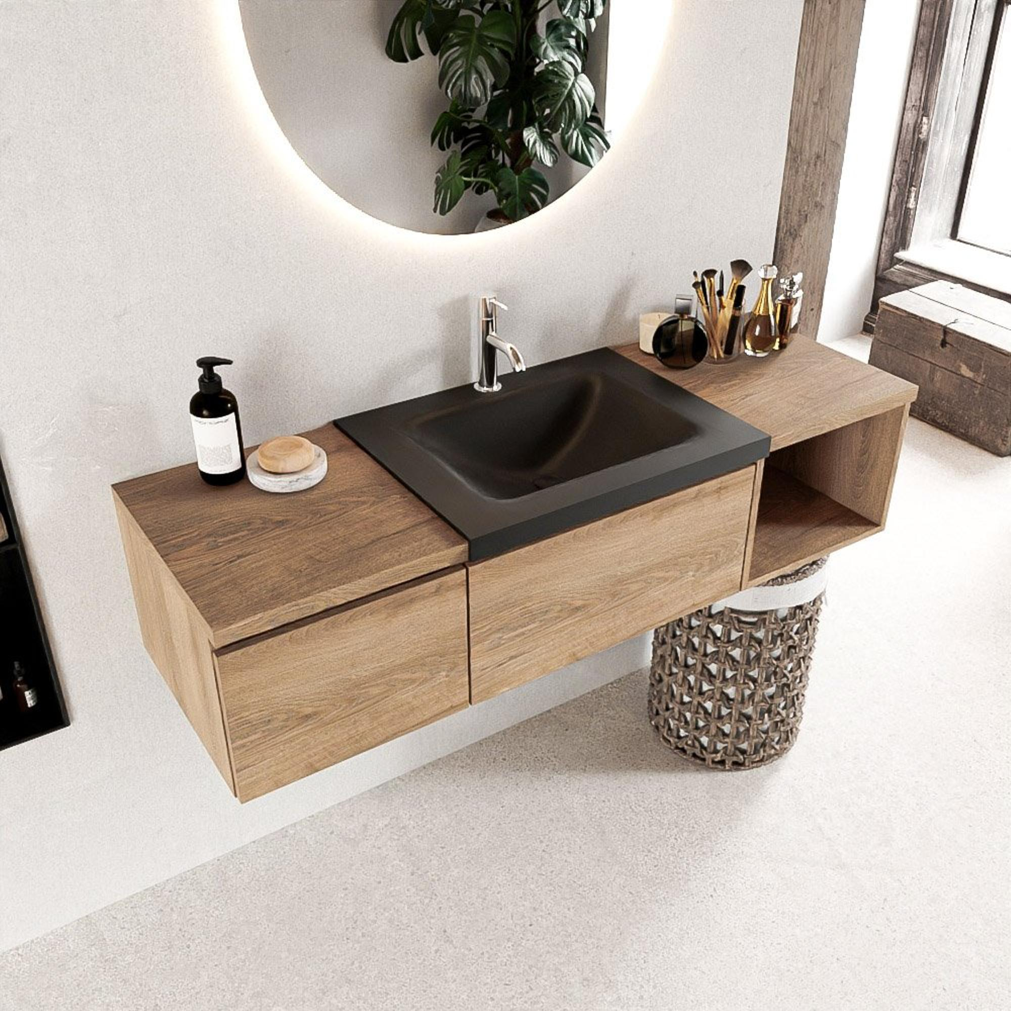 Dit badmeubel straalt stijl en klasse uit met zijn Washed Oak kleur en strakke lijnen. De open module aan de rechterkant voegt een speels element toe aan het ontwerp, terwijl de 2 lades zorgen voor voldoende opbergruimte voor al je badkamerbenodigdheden.