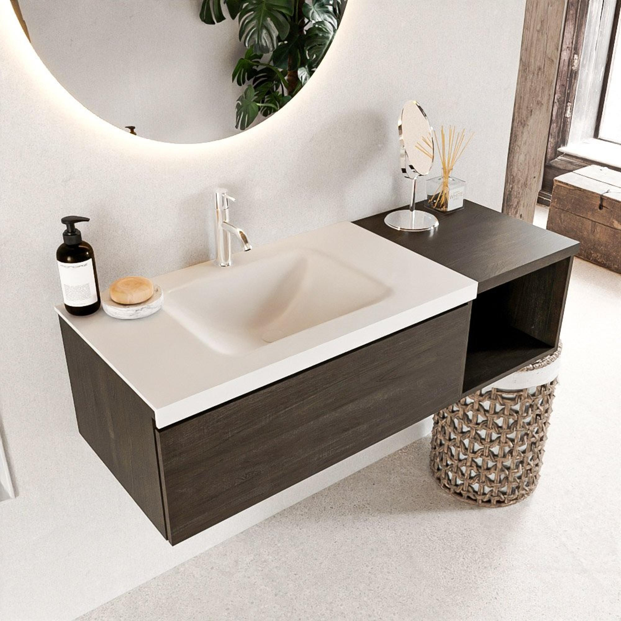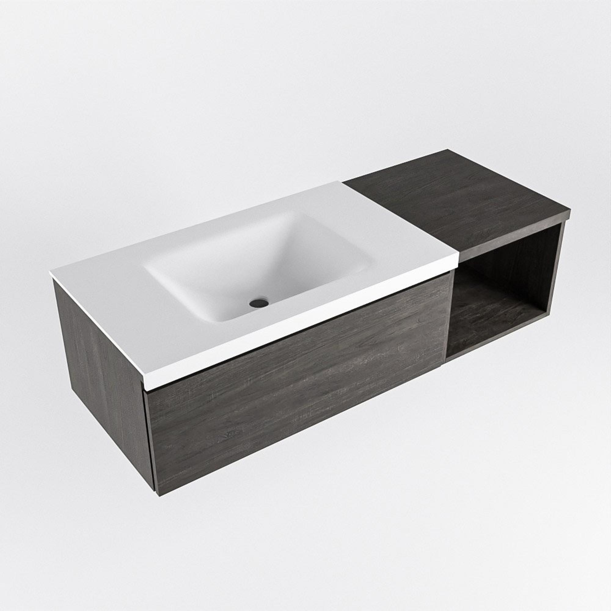 MONDIAZ BUKLA 120cm badmeubel met open module 40 kleur Dark Brown met 1 lade. Wastafel CLOUD links 1 kraangat kleur Talc.