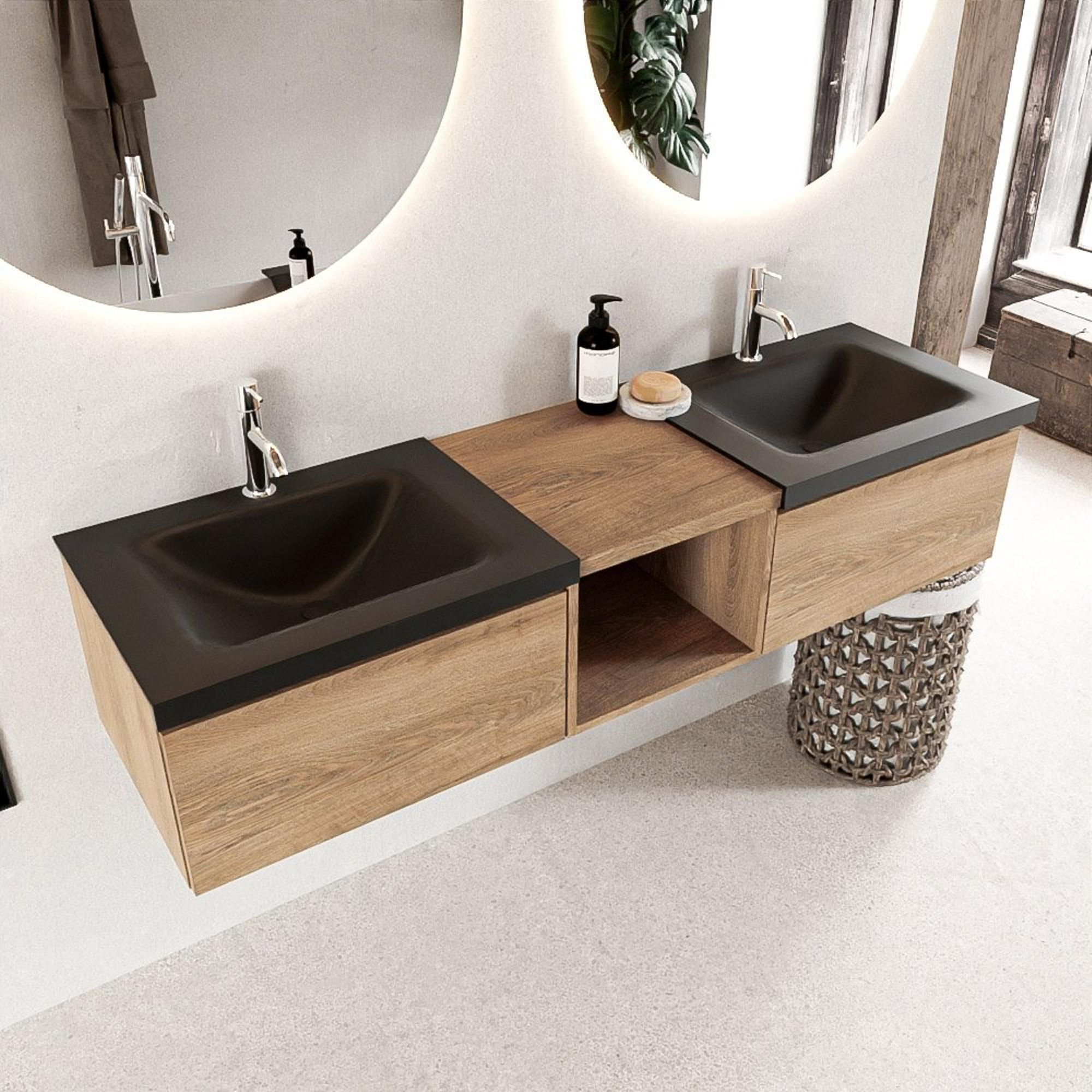 MONDIAZ BUKLA 160cm badmeubel met open module 40 kleur Washed Oak met 2 lades. Wastafel CLOUD dubbel 2 kraangaten kleur Urban.