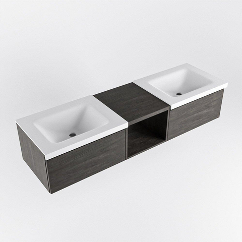 Dit badmeubel straalt elegantie uit met zijn strakke lijnen en donkere kleur. De open module geeft een luchtig gevoel aan de badkamer, terwijl de 2 lades zorgen voor georganiseerde opslag. De dubbele wastafel in de kleur Talc voegt een vleugje verfijning toe aan de ruimte, waardoor dit meubelstuk een echte eyecatcher is.