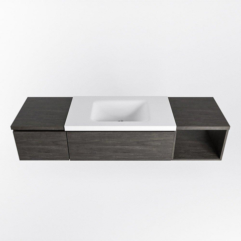 In een oogverblindende combinatie van stijl en functionaliteit, straalt dit badmeubel met open module en wastafel een tijdloze elegantie uit die jouw badkamer transformeert tot een oase van luxe en comfort. Met een lengte van 160cm en een prachtige Dark Brown afwerking, biedt dit meubel niet alleen voldoende opbergruimte met 2 lades, maar ook een verfijnde uitstraling die elke badkamer verrijkt. De Wastafel CLOUD in het midden met 1 kraangat in de kleur Talc voegt een vleugje verfijning toe, waardoor dit badmeubel een onmisbaar element wordt in jouw badkamerinterieur.