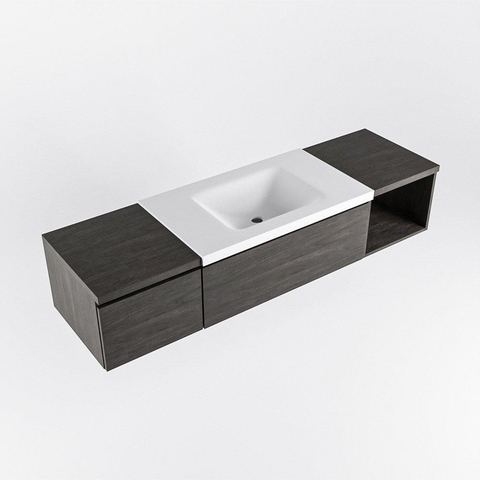 Met zijn strakke lijnen en moderne ontwerp is dit badmeubel een stijlvolle toevoeging aan elke badkamer. De combinatie van de donkere Dark Brown kleur en de lichte Talc wastafel zorgt voor een harmonieus contrast dat de ruimte verlevendigt. De open module aan de rechterkant geeft een ruimtelijk gevoel en maakt het gemakkelijk om je badkamerspullen georganiseerd te houden.