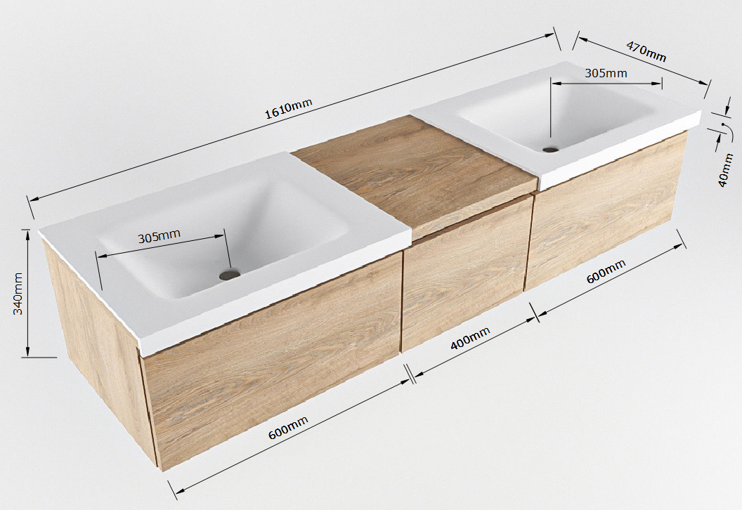 MONDIAZ BUKLA 160cm badmeubel met module 40 kleur Washed Oak met 3 lades. Wastafel CLOUD dubbel 2 kraangaten kleur Talc.