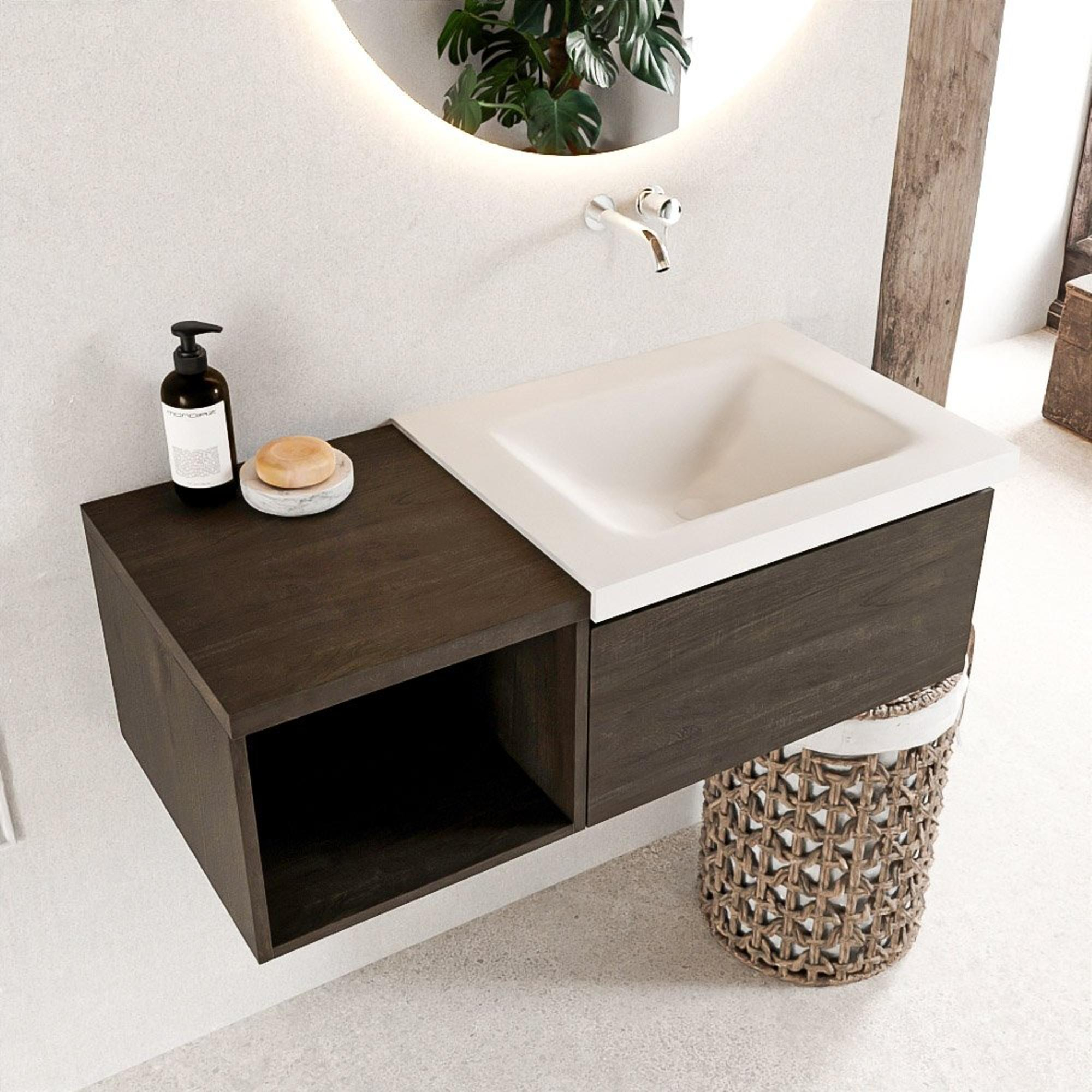In een oogwenk zal dit badmeubel met open module je badkamer transformeren tot een oase van stijl en functionaliteit. Met een lengte van 100 cm en een elegante Dark Brown kleur, straalt dit meubel klasse en verfijning uit. De bijgevoegde wastafel CLOUD aan de rechterkant voegt een vleugje moderniteit toe, terwijl de 1 lade voldoende opbergruimte biedt voor al je badkamerbenodigdheden.