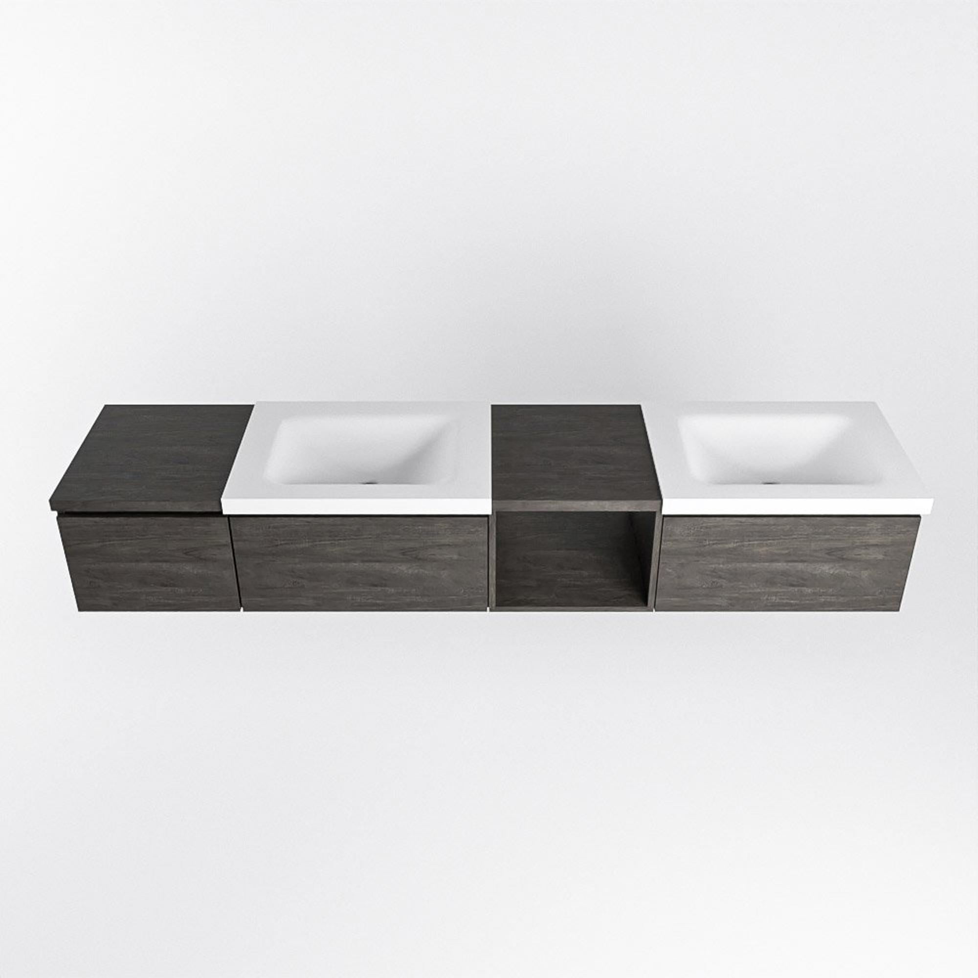 Dit badmeubel is een ware eyecatcher in elke badkamer. Het strakke ontwerp en de donkere kleur zorgen voor een moderne uitstraling die moeiteloos past bij diverse interieurstijlen. De open module aan de rechterkant geeft het geheel een luchtig en eigentijds gevoel, terwijl de lades zorgen voor praktische opbergmogelijkheden.
