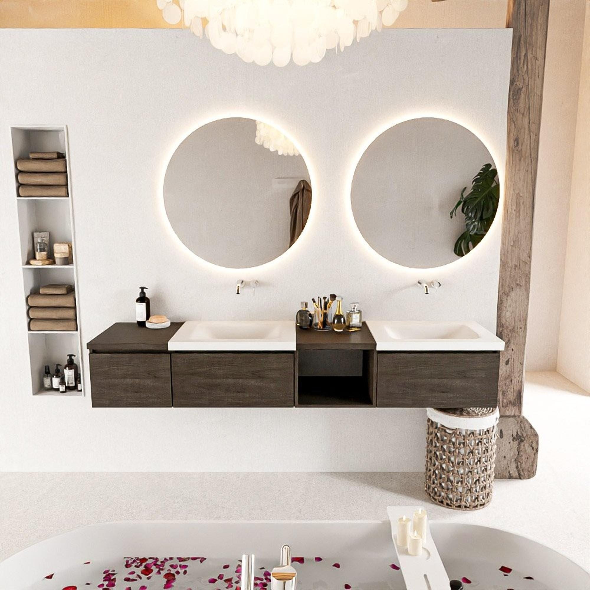 Ervaar ultieme luxe met dit badmeubel, dat is ontworpen met oog voor detail en kwaliteit. De Dark Brown kleur geeft een warme en uitnodigende uitstraling, terwijl de open module een modern tintje toevoegt aan de badkamer. De dubbele wastafel zorgt voor extra gemak en functionaliteit, waardoor jouw ochtendroutine een plezier wordt.