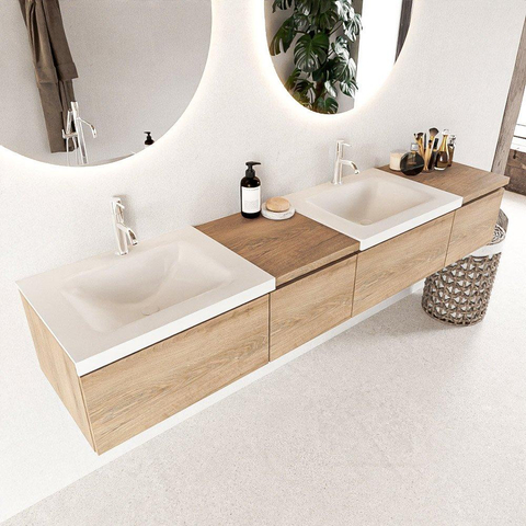 MONDIAZ BUKLA 200cm badmeubel met module 40 links kleur Washed Oak met 4 lades. Wastafel CLOUD dubbel 2 kraangaten kleur Talc.