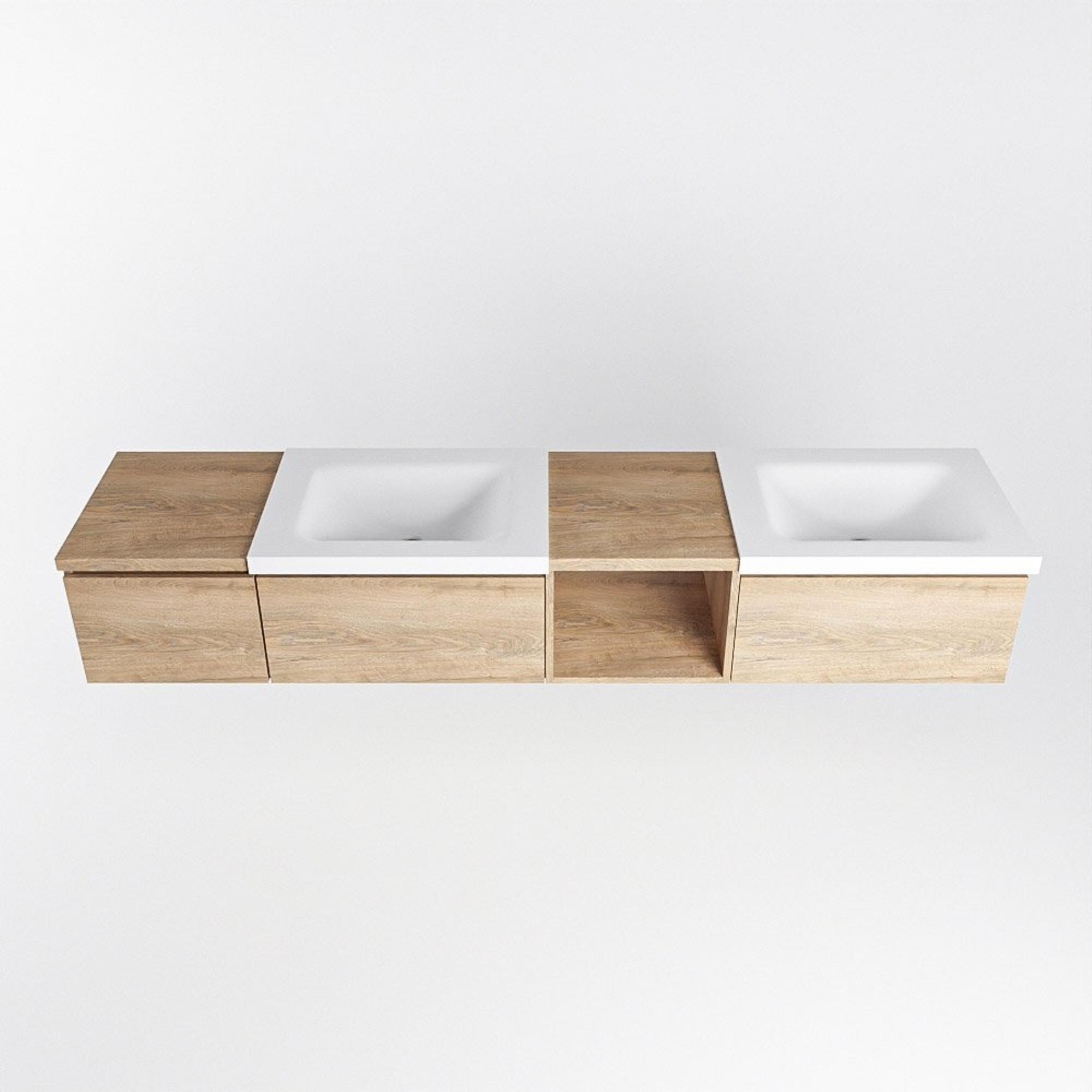 MONDIAZ BUKLA 200cm badmeubel met open module 40 rechts kleur Washed Oak met 3 lades. Wastafel CLOUD dubbel 2 kraangaten kleur Talc.