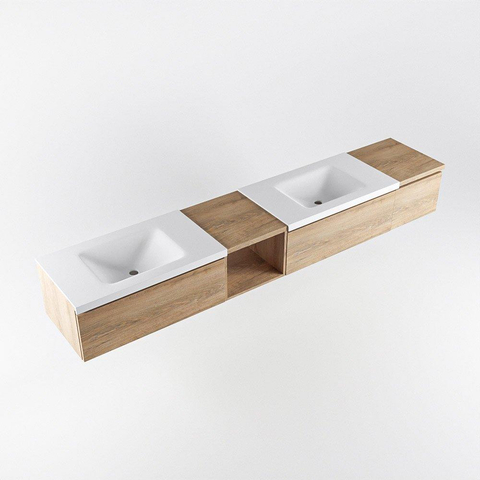 MONDIAZ BUKLA 240cm badmeubel met open module 40 links kleur Washed Oak met 3 lades. Wastafel CLOUD dubbel 0 kraangaten kleur Talc.