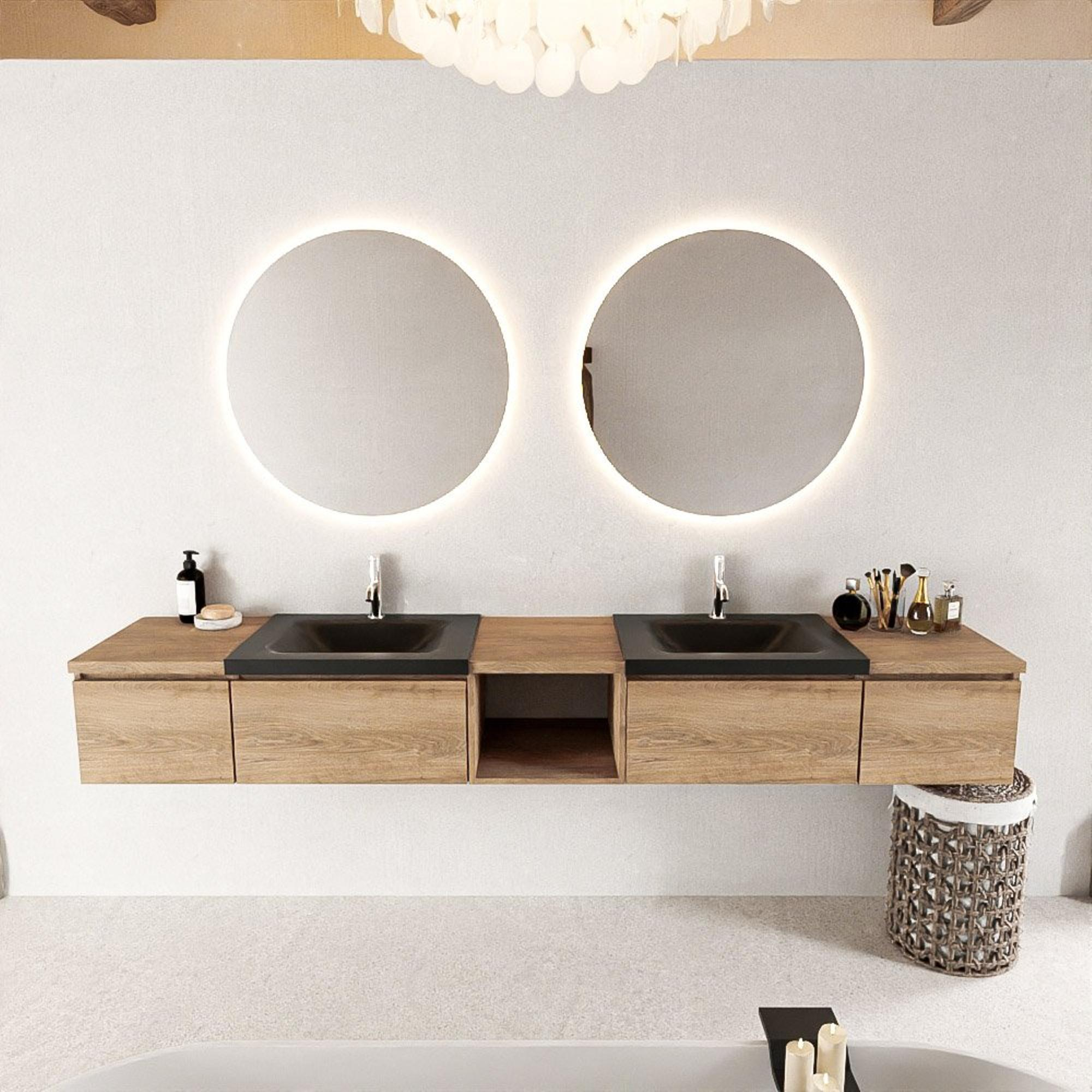 MONDIAZ BUKLA 240cm badmeubel met open module 40 midden kleur Washed Oak met 4 lades. Wastafel CLOUD dubbel 2 kraangaten kleur Urban.