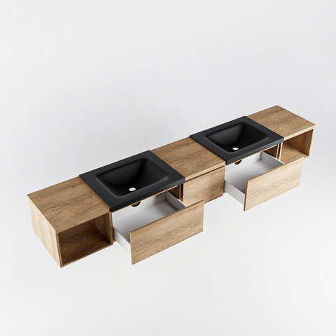 MONDIAZ BUKLA 240cm badmeubel met open module 40 L+R kleur Washed Oak met 3 lades. Wastafel CLOUD dubbel 2 kraangaten kleur Urban.