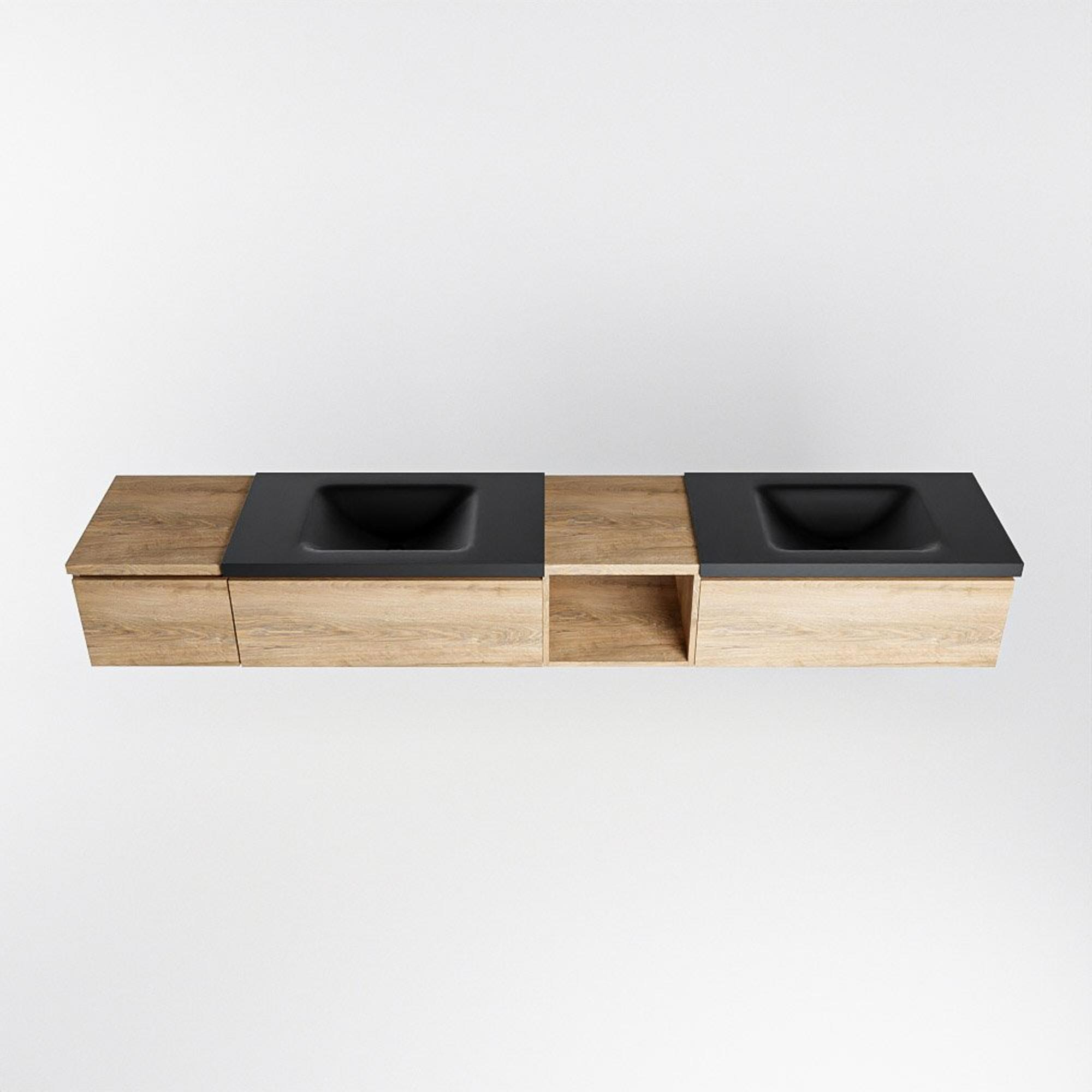 MONDIAZ BUKLA 240cm badmeubel met open module 40 rechts kleur Washed Oak met 3 lades. Wastafel CLOUD dubbel 2 kraangaten kleur Urban.