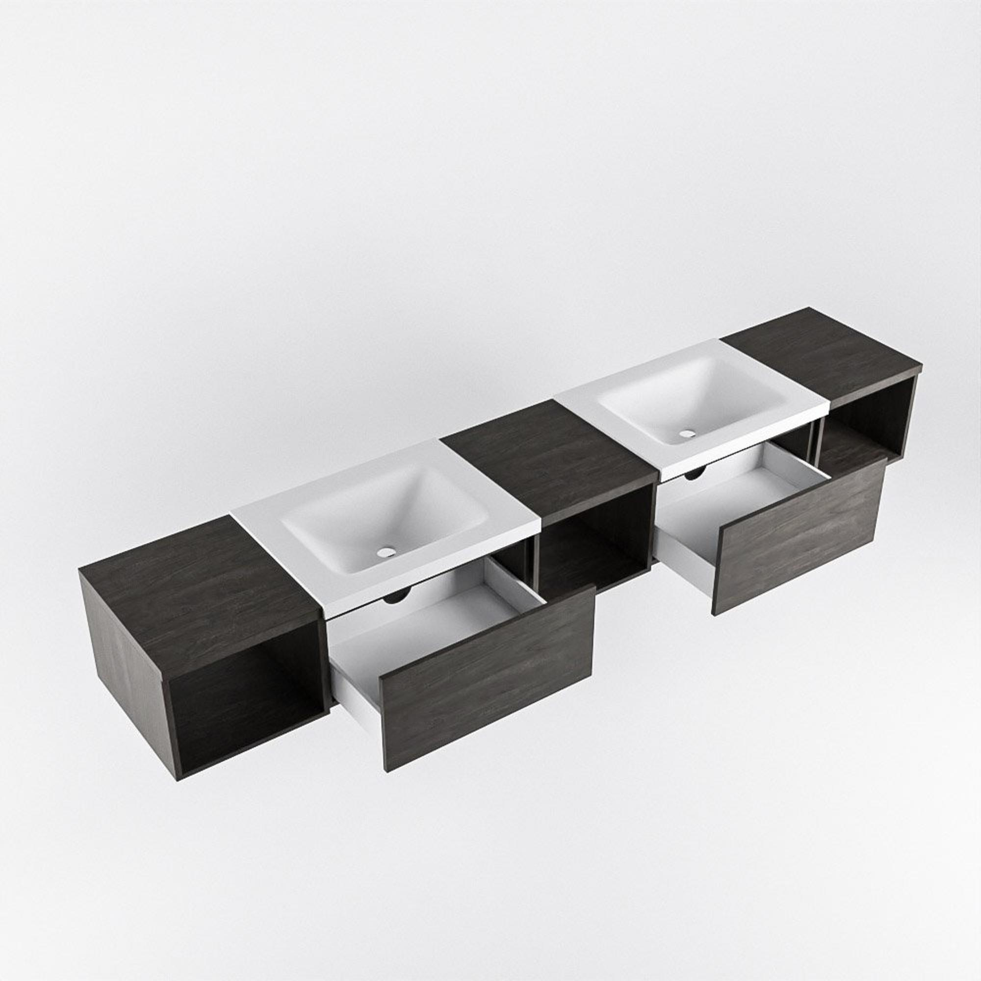 Dit badmeubel is niet alleen een lust voor het oog, maar ook uiterst praktisch in gebruik. De slimme indeling met twee lades biedt voldoende opbergruimte voor al jouw badkamerspullen, terwijl de open module ruimte biedt voor het tentoonstellen van jouw favoriete accessoires. Met de dubbele wastafel en kraangaten is dit meubel perfect voor dagelijks gebruik, terwijl de hoogwaardige materialen zorgen voor een eenvoudig onderhoud.