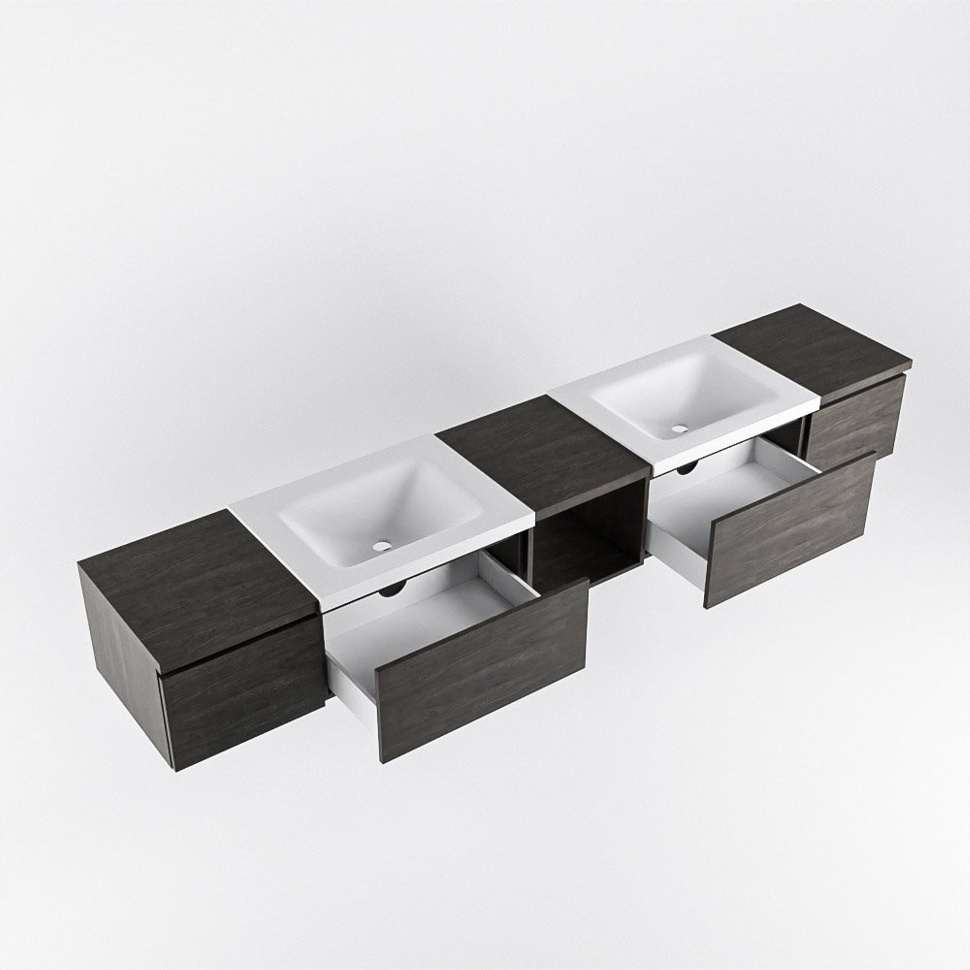 Met zijn diepe Dark Brown kleur en strakke lijnen straalt dit badmeubel een tijdloze elegantie uit. De open module zorgt voor een luchtige uitstraling en biedt voldoende ruimte om je badkameraccessoires netjes op te bergen. De vier lades zorgen voor extra opbergruimte, terwijl de dubbele wastafel een gevoel van luxe toevoegt aan de ruimte.