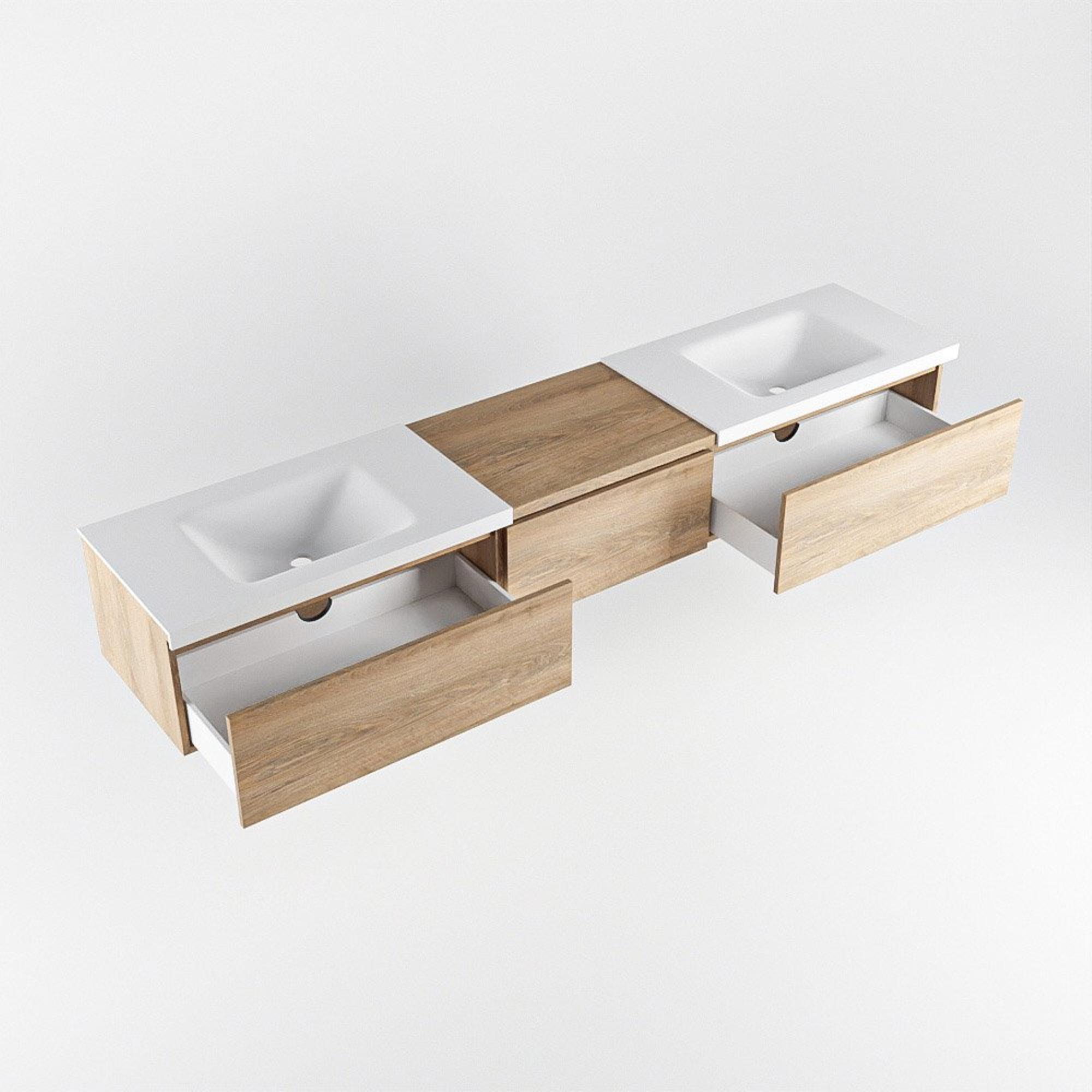 MONDIAZ BUKLA 220cm badmeubel met module 60 kleur Washed Oak met 3 lades. Wastafel CLOUD dubbel 0 kraangaten kleur Talc.